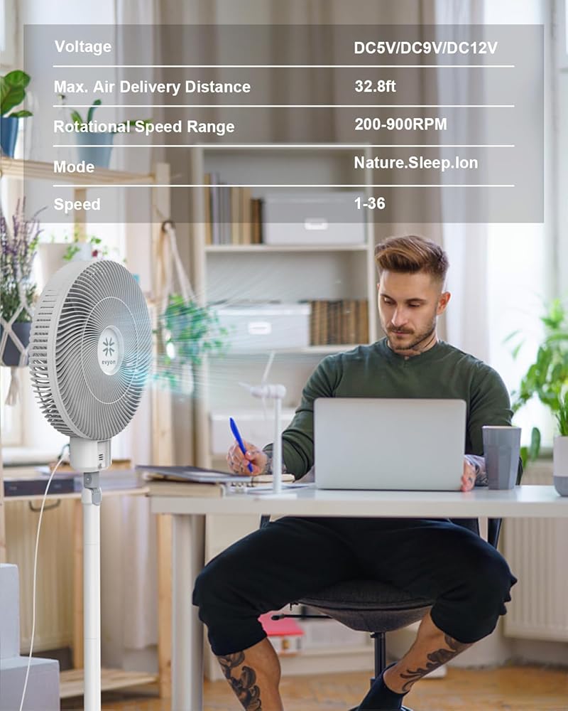 15db Quiet Fans for Home with 36 Speeds The patented double-layer fan blade technology allows for low noise, large airflow. With the support of a DC motor, the noise level is only 15 dB in sleep mode(1-10 Wind Speed),Daily use is 20db, Maximum wind speed noise control below 35db(36Wind Speed). The stand up fans for bedroom has 3 modes(sleep wind/lon wind/natural wind mode) and ranging maximum 4.2m/s. Allowing you to enjoy a peaceful environment for sleeping,studying or working.