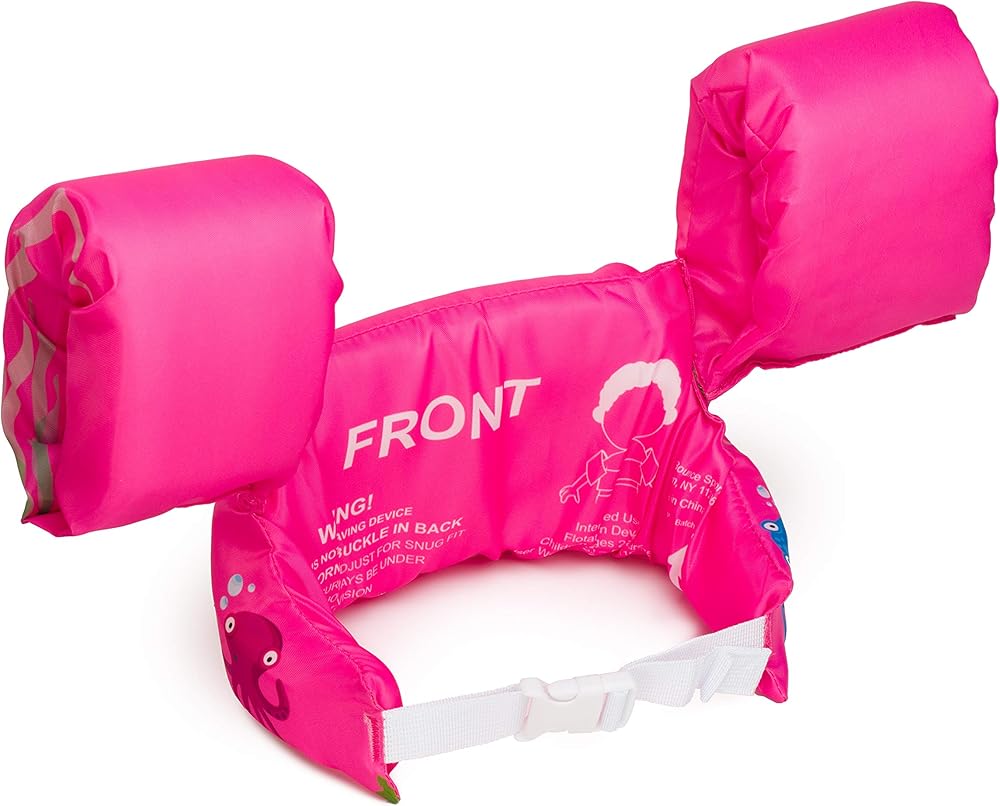 Attached arm wings ensure that it does not slip off and the adjustable strap and buckle make it easy to fit on any child, designed for children weighing 30-50 pounds.