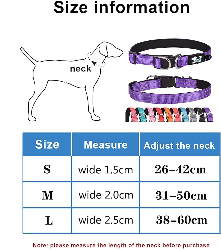 Measure your dog's neck before purchase, using a soft measuring tape or piece of string.Make sure buy right size dog collar.