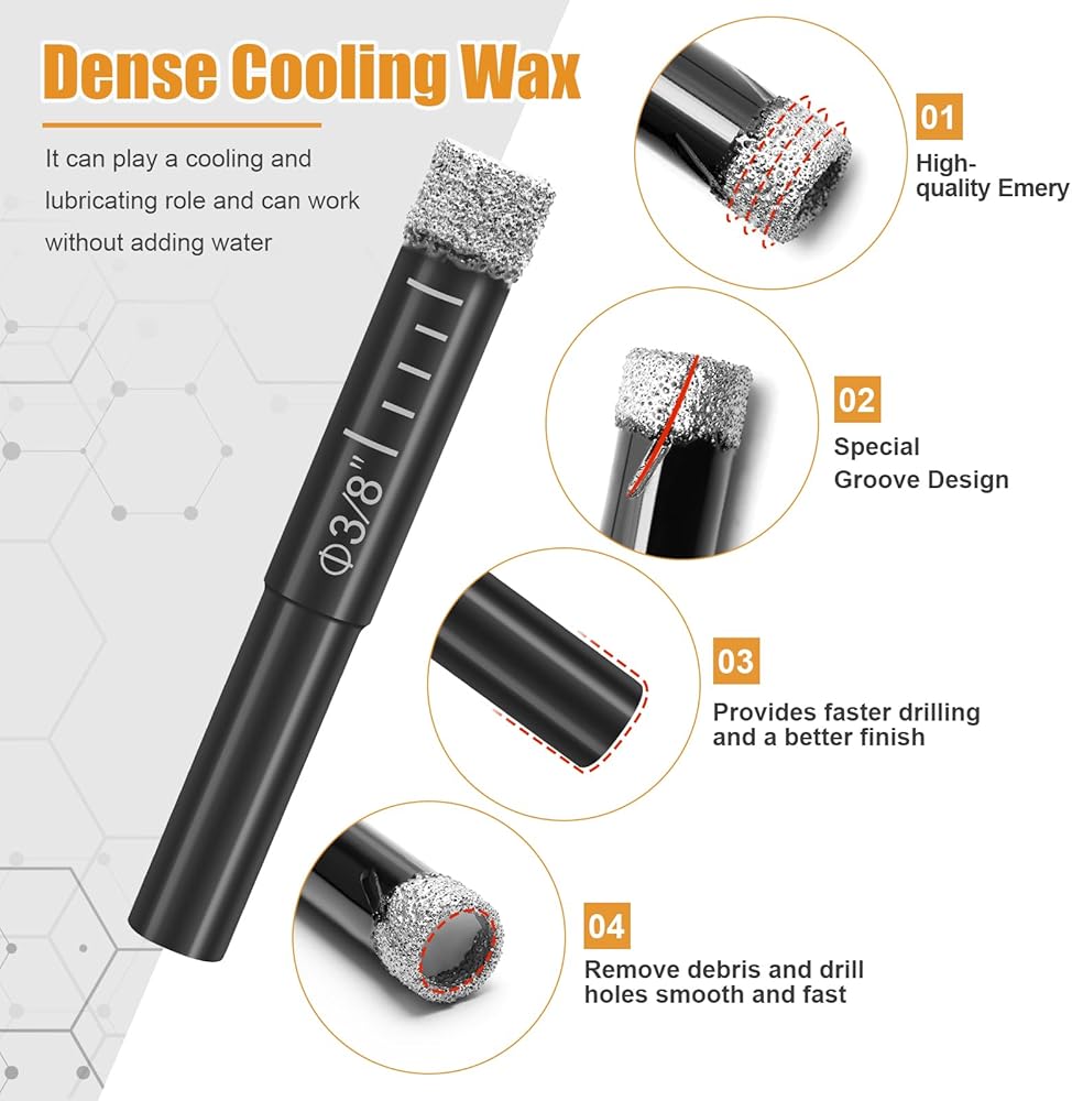 【ابتكار الحفر الجاف】- تم دمج لقمة الحفر الماسية الخاصة بنا مع مادة تشحيم الشمع بالداخل مما يمنع فقدان الماس ويطيل عمر القطع. للحفاظ على الأداء الأمثل، نقترح الإيقاف المؤقت والتبريد لقمة الحفر بعد كل ثقب.