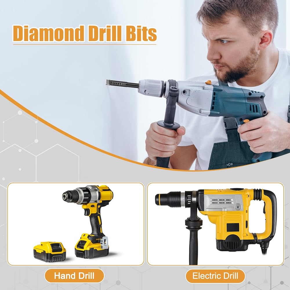 【التوافق:- تتوافق رؤوس الثقب الماسية مع المثاقب الكهربائية والمثاقب اليدوية ومطاحن الزوايا ومثاقب المقاعد لمزيد من الراحة.
