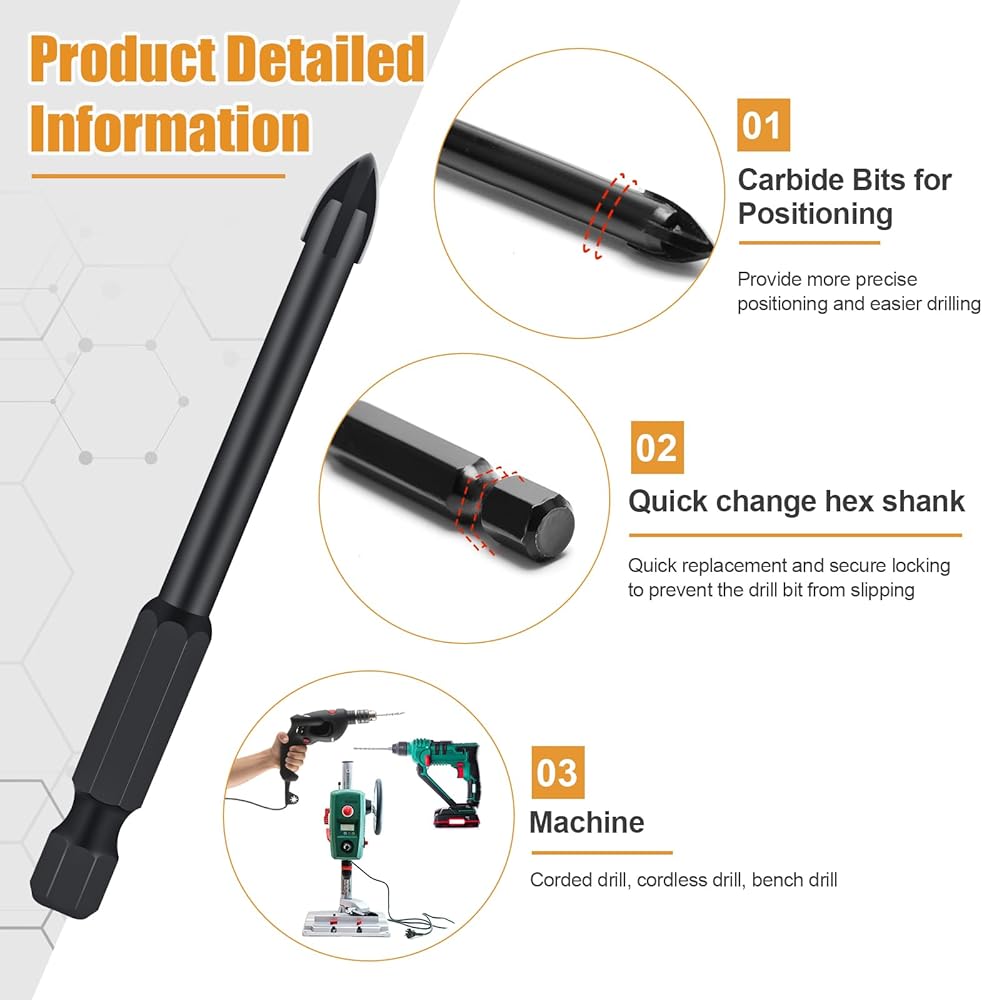 【عرقوب سداسي】- مجموعة رؤوس مثقاب البلاط مجهزة بمقبضين سداسيين. يوفر الاستبدال السريع للمقبض السداسي قبضة وملاءمة أفضل، مما يجعله متوافقًا مع معظم الآلات.