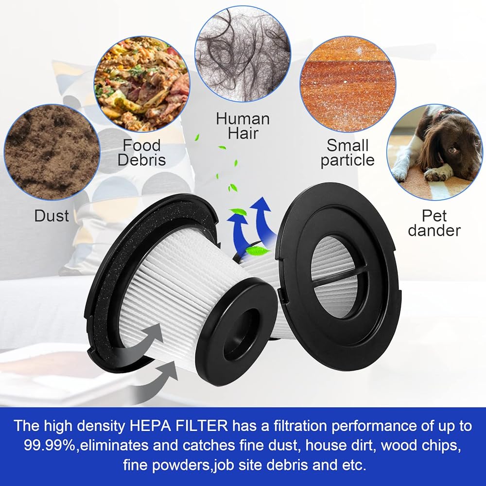 • أداء ترشيح عالي يصل أداء الفلترة إلى 99.99%، والذي يمكنه تصفية الشعر والغبار والطعام ولوازم الحيوانات الأليفة وما إلى ذلك. نوصي بتحديث الفلتر كل 2-3 أشهر وفقًا للاستخدام للحفاظ على أداء عمل المكنسة الكهربائية وإطالة أمده.