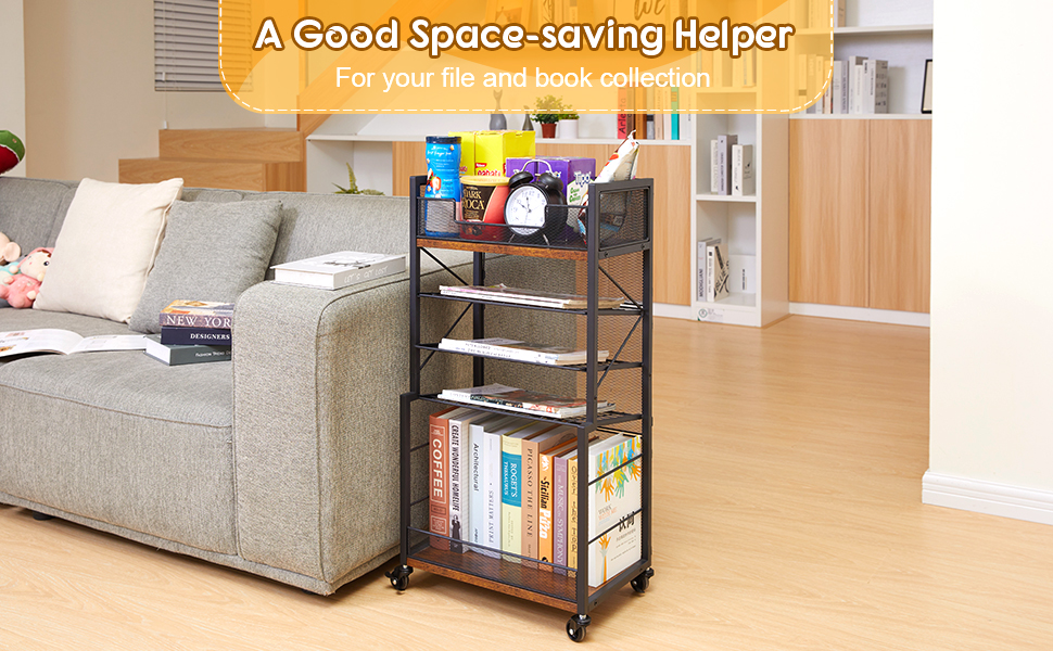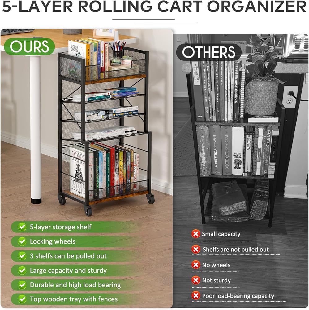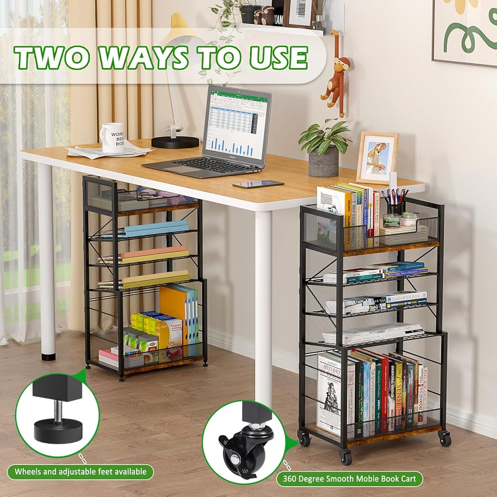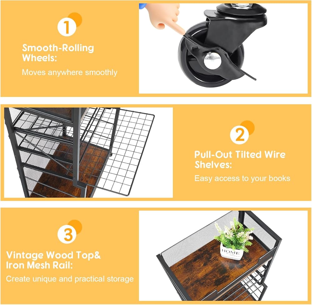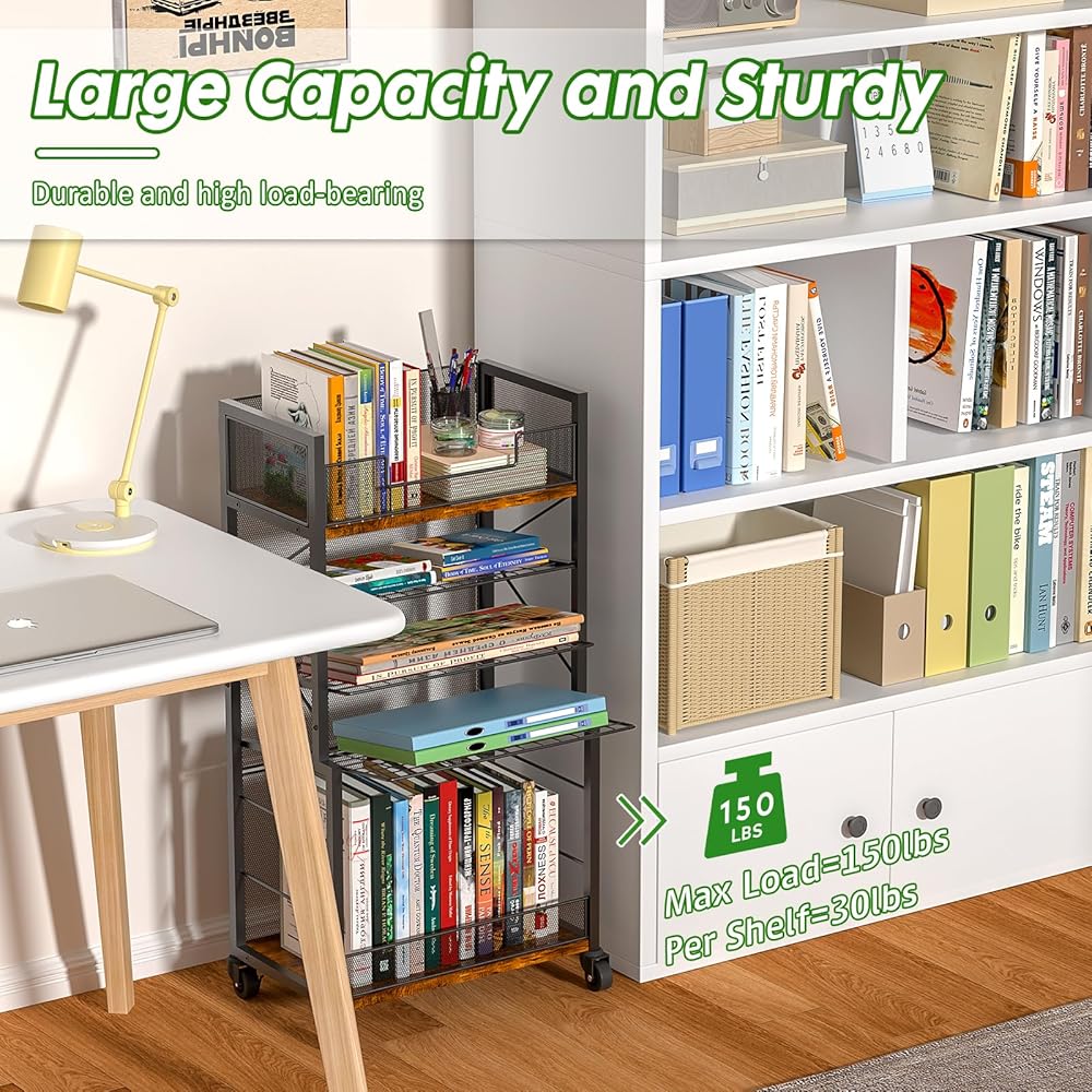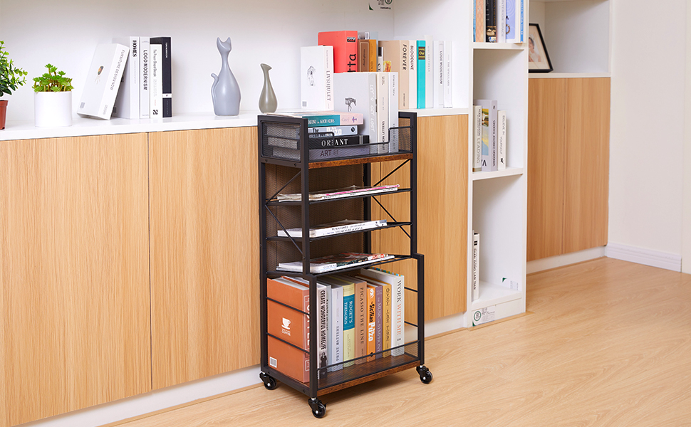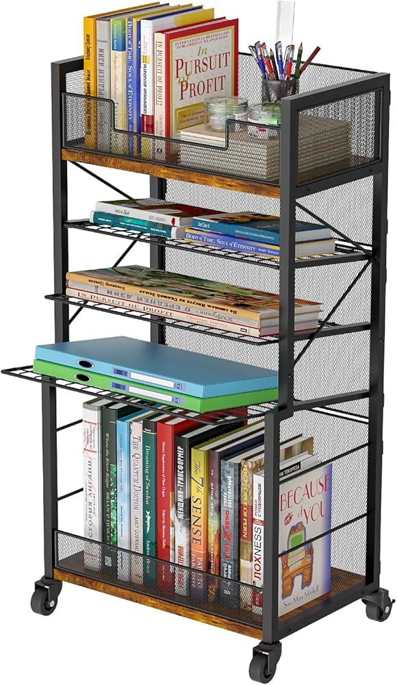 عربة كتب دوارة من 5 طبقات من Heyxiha مع صواني منزلقة، منظم مجلد ملفات بعجلات، خزانة كتب تخزين رف كتب متحرك، عربة أدوات معدنية وخشبية، حامل ورق صغير للمكتب والمدرسة والمنزل