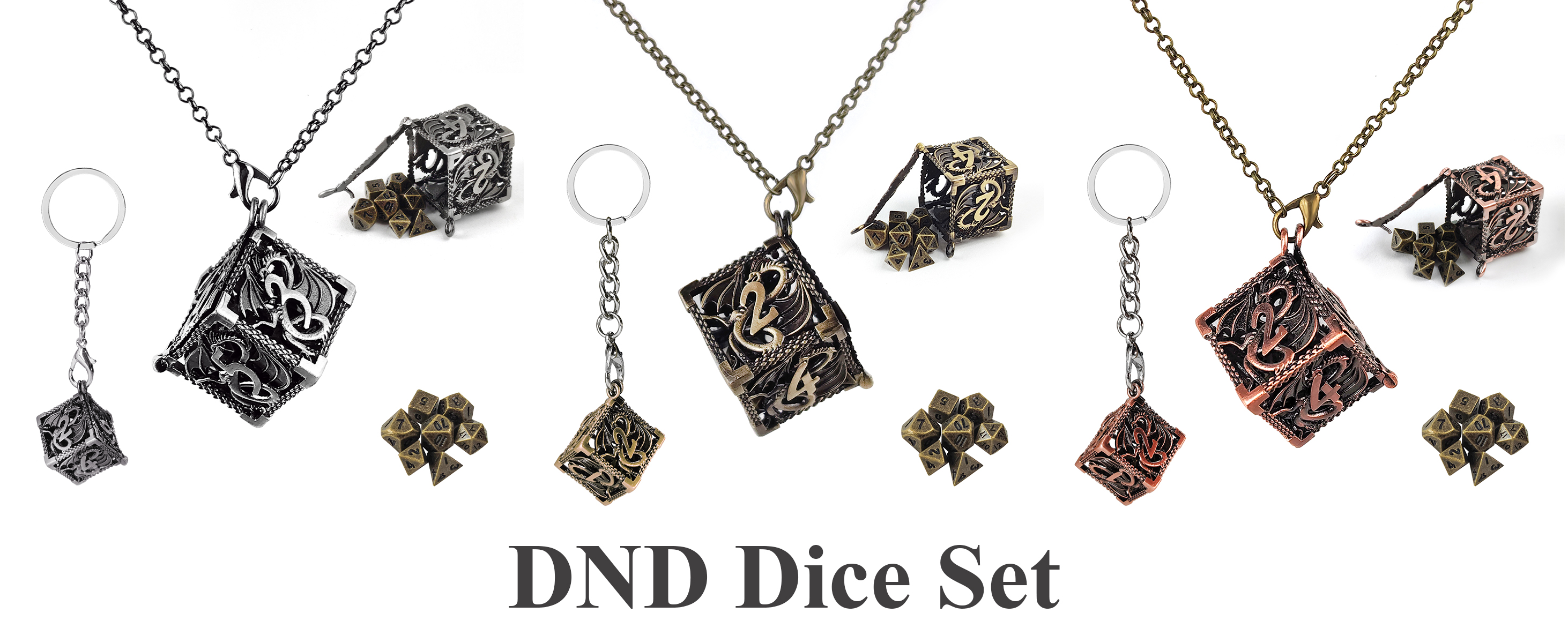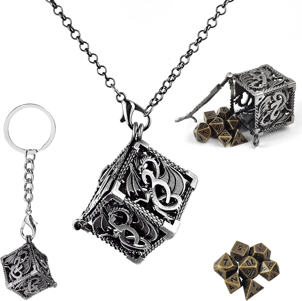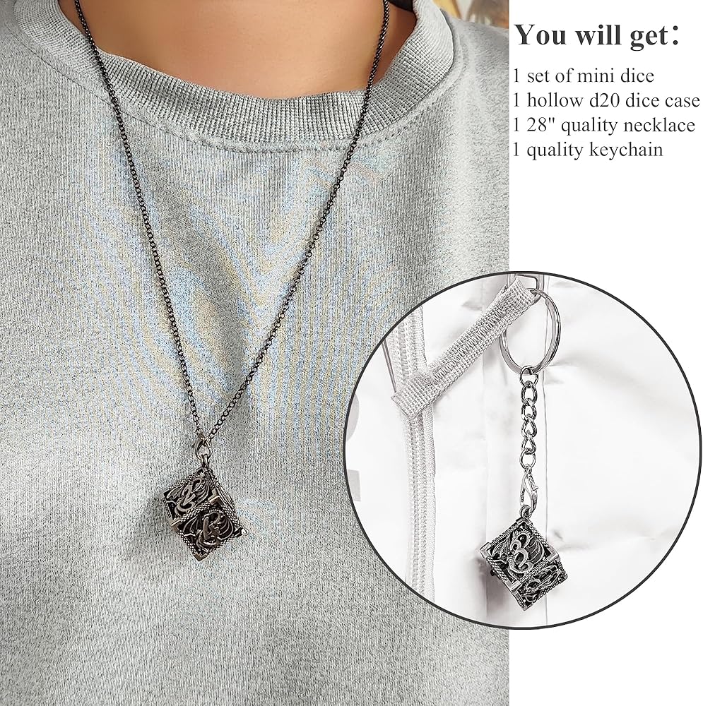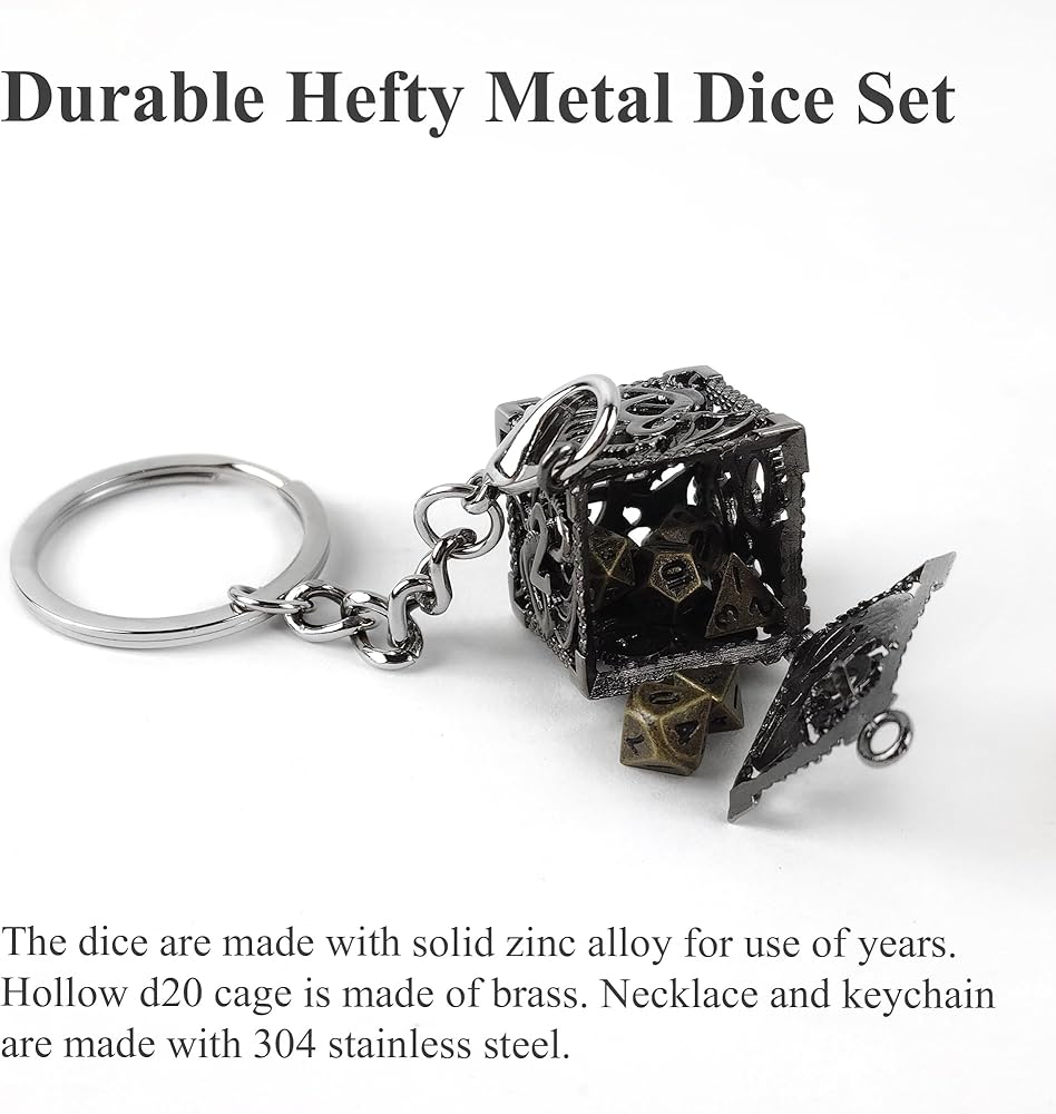قلادة جديدة ونرد سلسلة مفاتيح: باعتبارنا بكرات النرد متعطشة، نريد أن يكون النرد سهل الاستخدام وآمنًا أيضًا. لذلك قمنا بتصميم علبة نرد مجوفة d20 تحمل هذه النرد الصغيرة. مع سلسلة المفاتيح المصنوعة من الفولاذ المقاوم للصدأ مقاس 28 بوصة، يمكن الآن حمل النرد إلى أي مكان آمن وسليم!