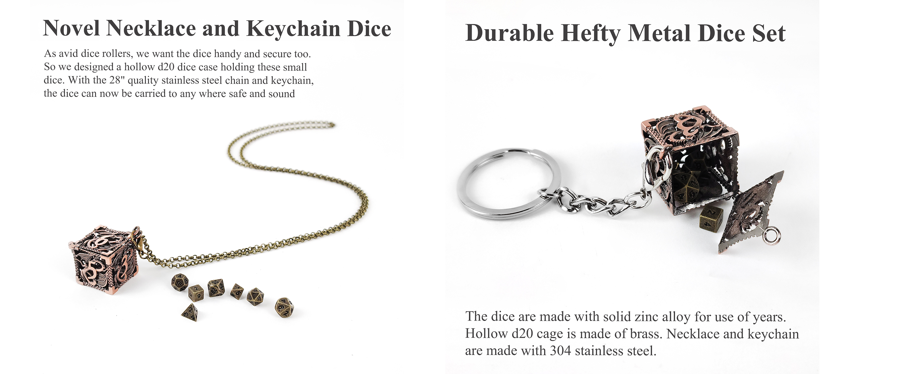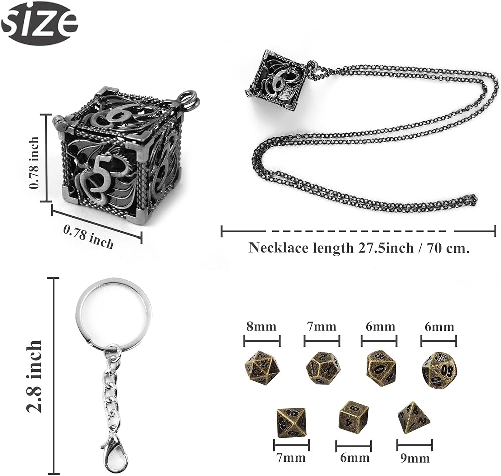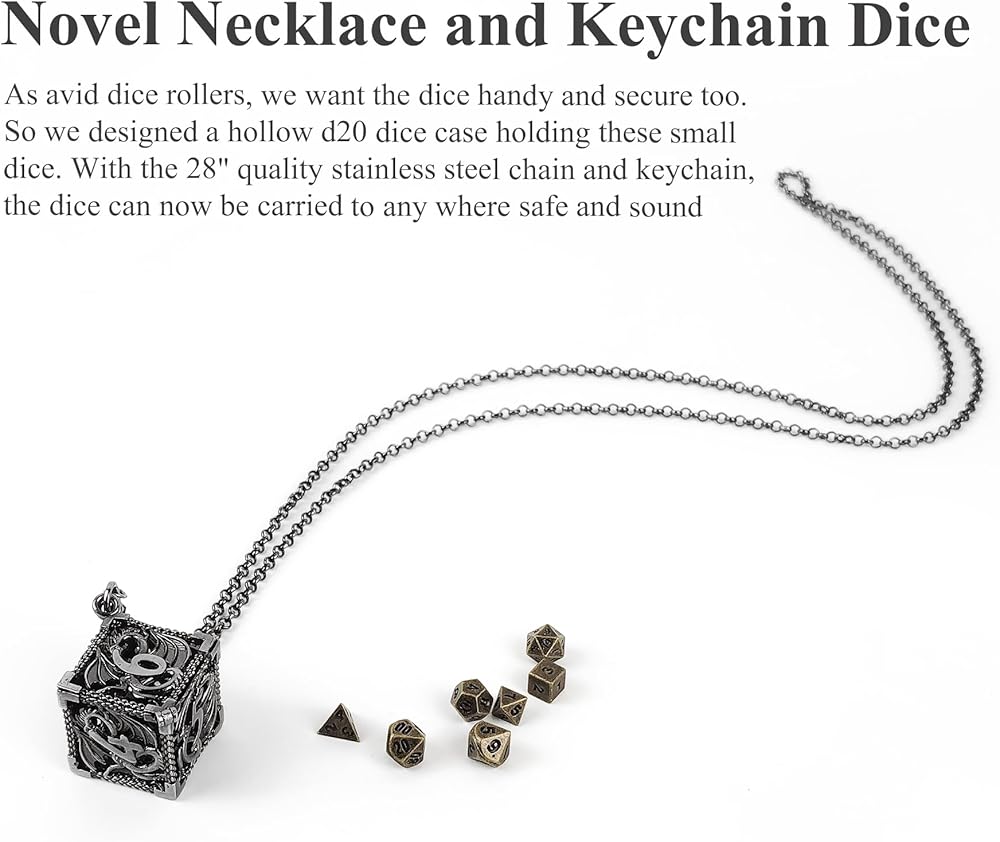مجموعة النرد المعدنية المتينة: النرد مصنوع من سبائك الزنك الصلبة للاستخدام لسنوات. القلادة وسلسلة المفاتيح مصنوعة من الفولاذ المقاوم للصدأ 304.