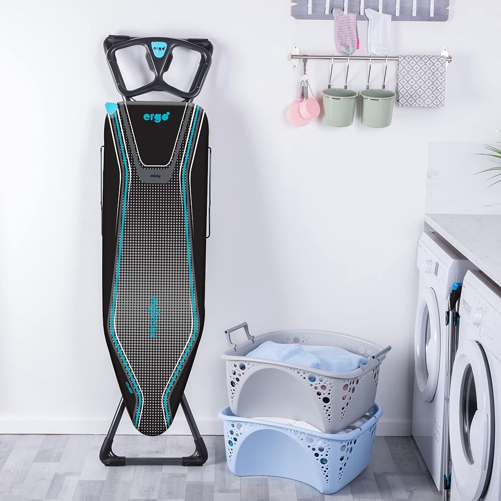 طاولة الكي مينكي إيرجو بلس بروزون | صنع في المملكة المتحدة | غطاء عاكس للحرارة، تصميم حلقة ساق ثابتة ورف من الكتان - لوح كي قائم بذاته مع سطح كي كبير مقاس 48 بوصة × 15 بوصة (معدني وأزرق)