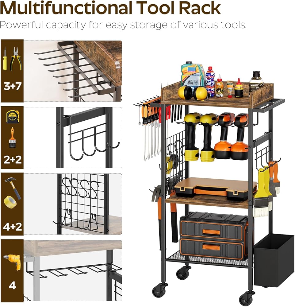تخزين كافٍ: يتميز منظم الأدوات الكهربائية هذا بثلاثة أرفف، ورف تعليق، وسلة جانبية، وحامل مثقاب، وخطافات متحركة متنوعة، مما يوفر تخزينًا مصنفًا للأدوات والأجزاء المختلفة. فهو يتيح سهولة التنظيم والوصول إلى العناصر الخاصة بك