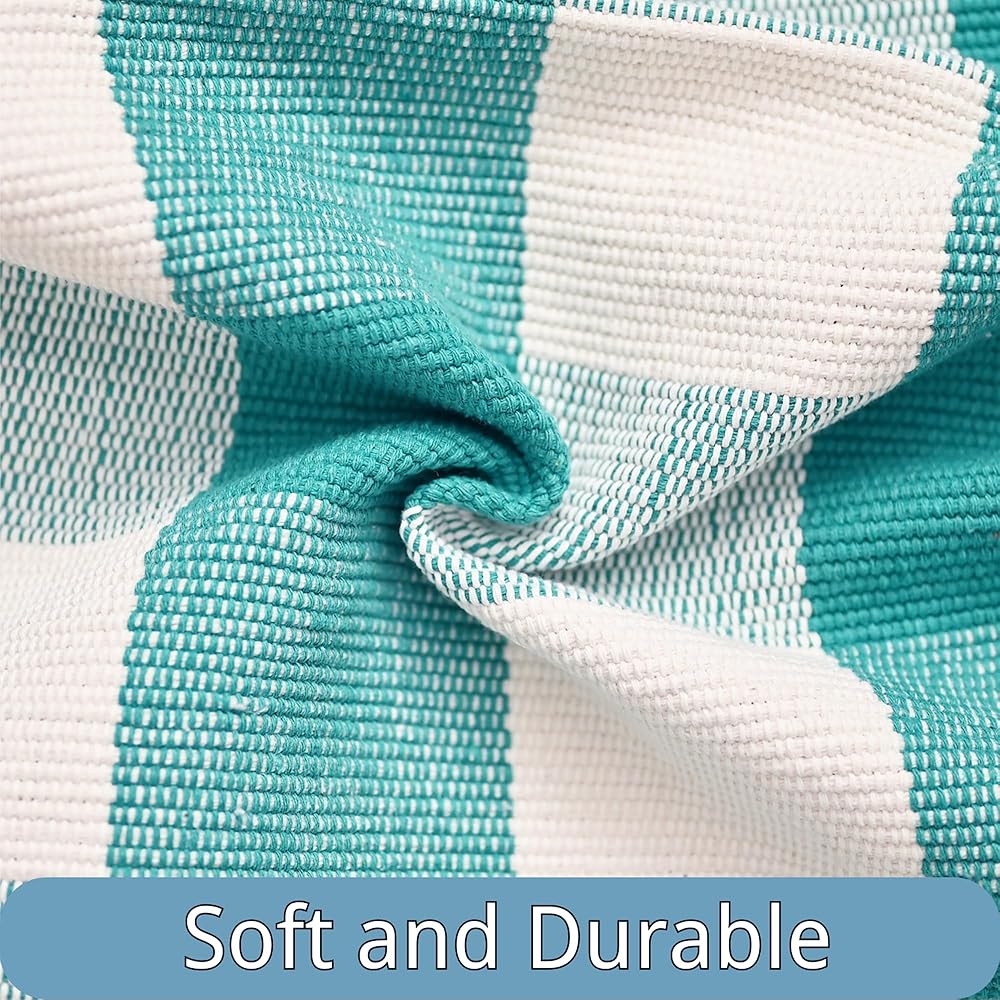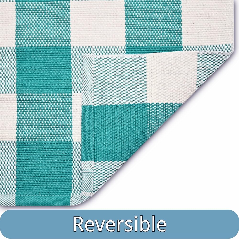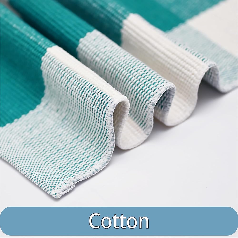 السجاد المنقوش باللونين الأخضر والأبيض مصنوع من القطن المنسوج، وهو متين وقوي، ومناسب للأماكن الخارجية والبهو وغيرها من المناطق ذات حركة المرور العالية.