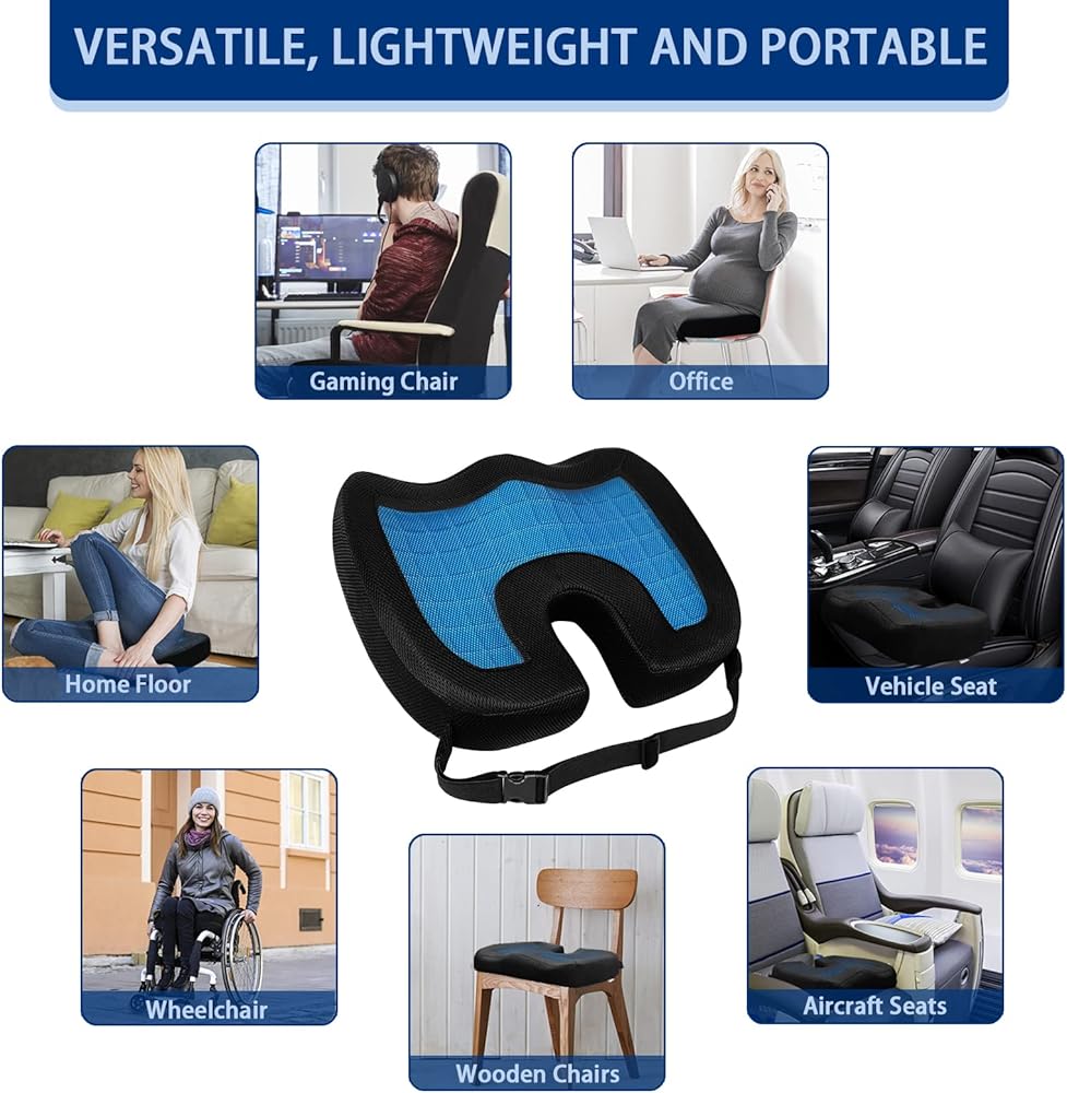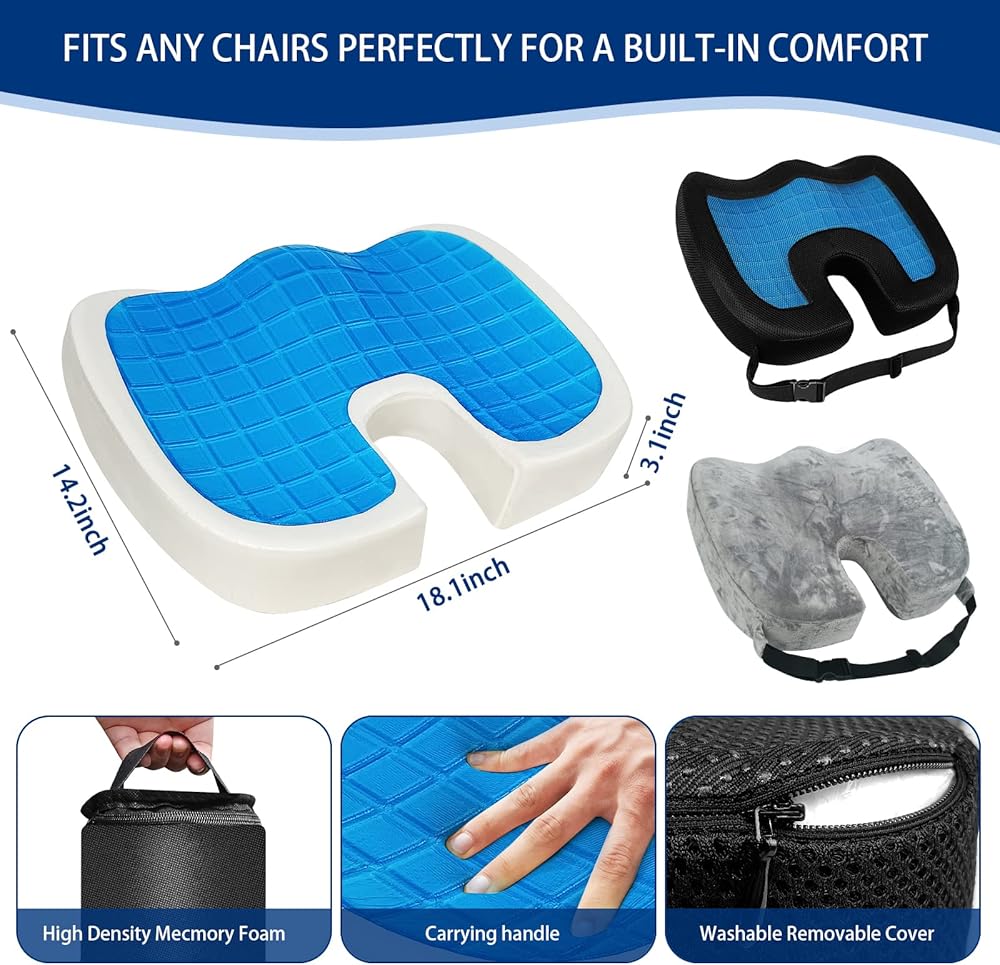 【الوسادة الأكثر راحة】تتميز وسادة المقعد المخصصة لتقويم العظام في وسادة المقعد المعززة بالجل بتصميم على شكل حرف U مع مركز مجوف لتقليل الضغط على عظم الذنب/الفقرات الذيلية وتعزيز الوضع الصحي. يقلل هذا التصميم من عدم الراحة الناتج عن الجلوس لفترات طويلة، مما يجعله الوسادة الأكثر راحة المتاحة. يضمن الجزء السفلي المطاطي غير القابل للانزلاق وغطاء السحاب القابل للغسل في الغسالة سهولة التنظيف والصيانة (يأتي مع غطاءين بسحّاب).