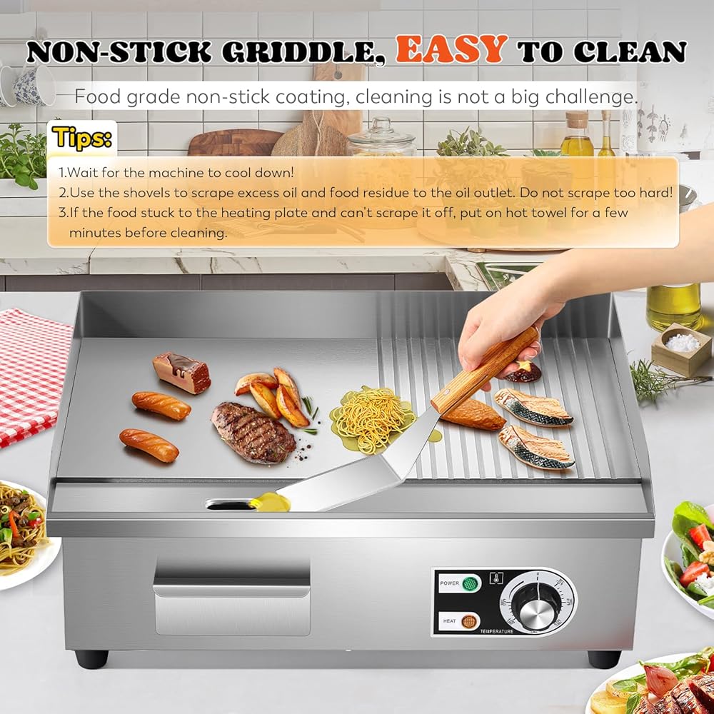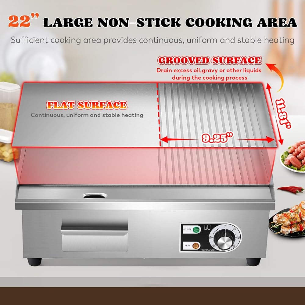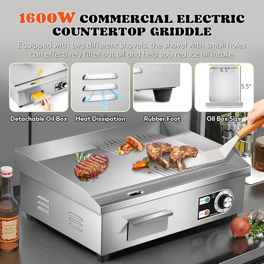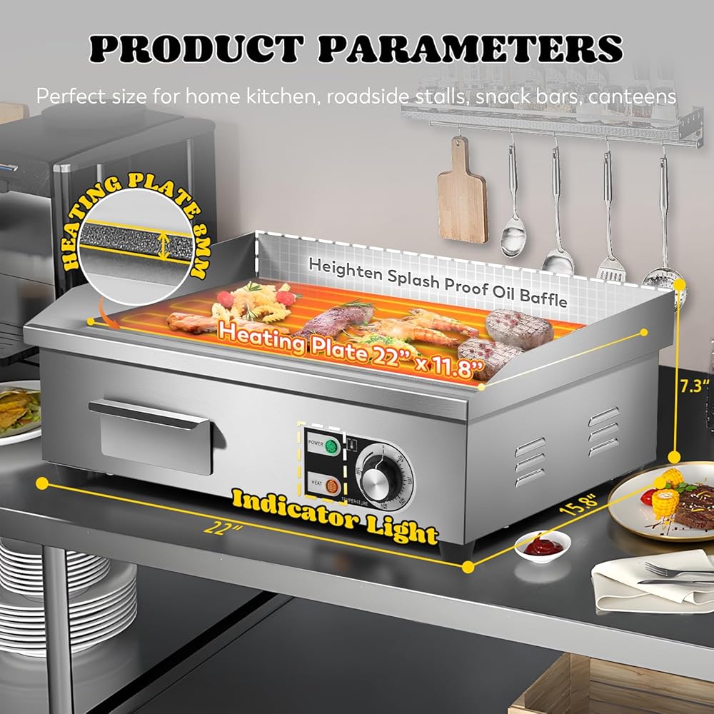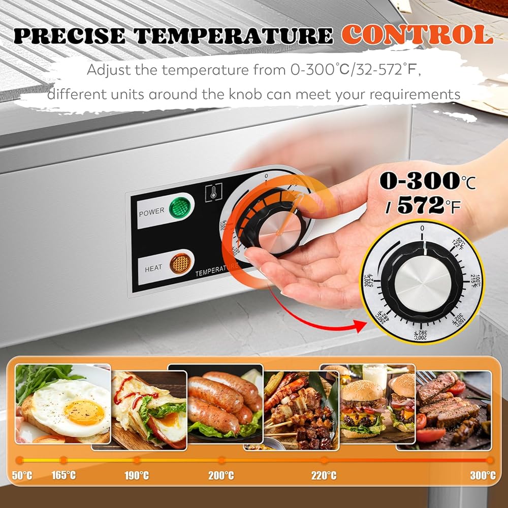 • تسخين فعال وموحد - الشواية الكهربائية التجارية مصنوعة من الفولاذ المقاوم للصدأ الفاخر، لطهي الطعام اللذيذ في منطقة الطبخ الكبيرة. لوحة تسخين سميكة 8 مم (0.3 بوصة)، أكثر قوة ومتانة، وتوفر تسخين فعال وموحد.