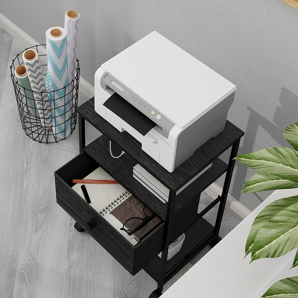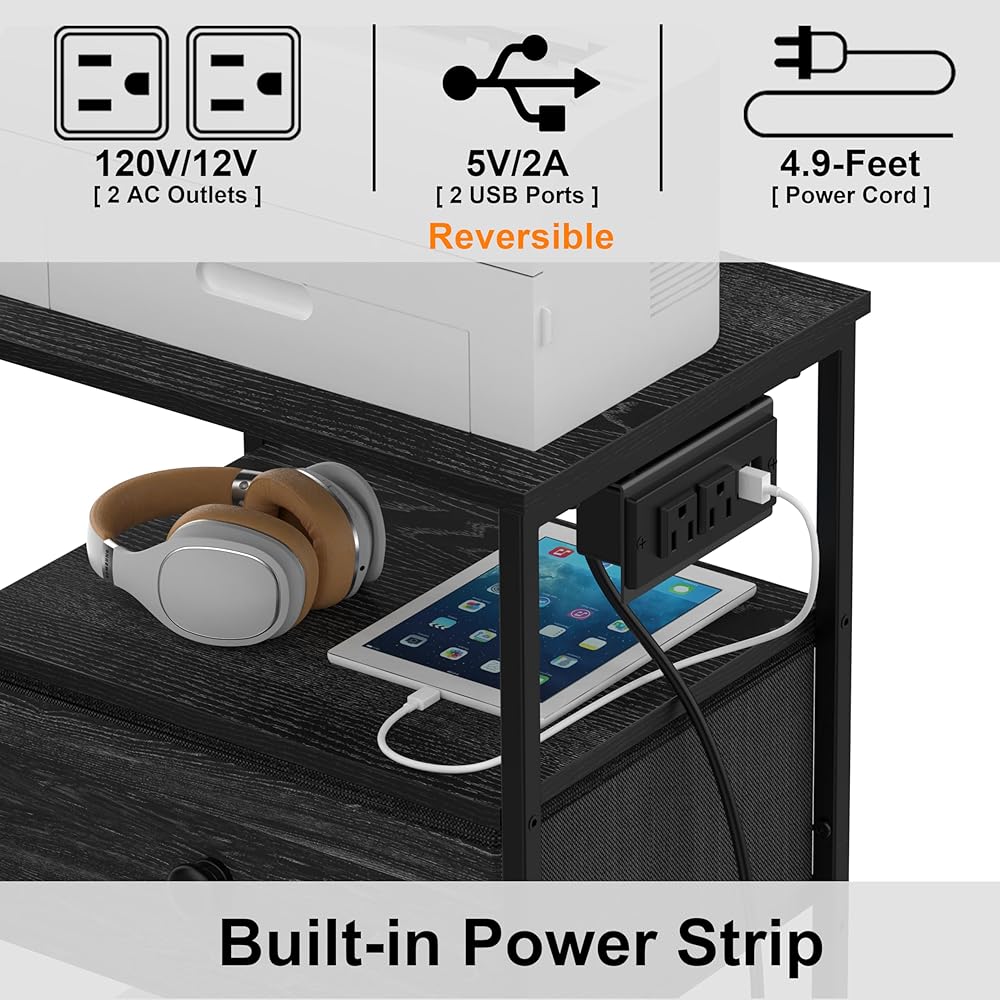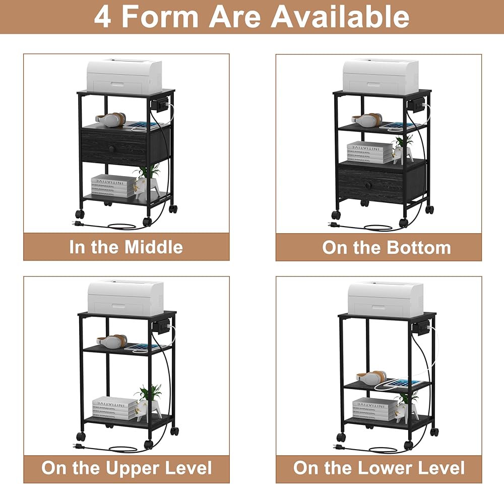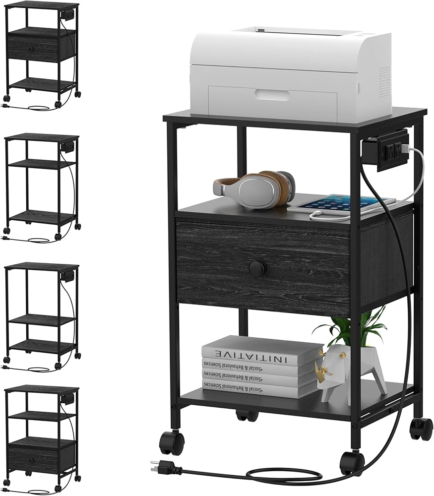 حامل طابعة VEDECASA ذو 3 طبقات مع محطة شحن، ومنفذ USB، وطاولة طابعة مع أدراج قماشية للتخزين، ورف مفتوح قابل للتعديل، للمكتب المنزلي، والنوم، وغرفة المعيشة، بني (أسود)