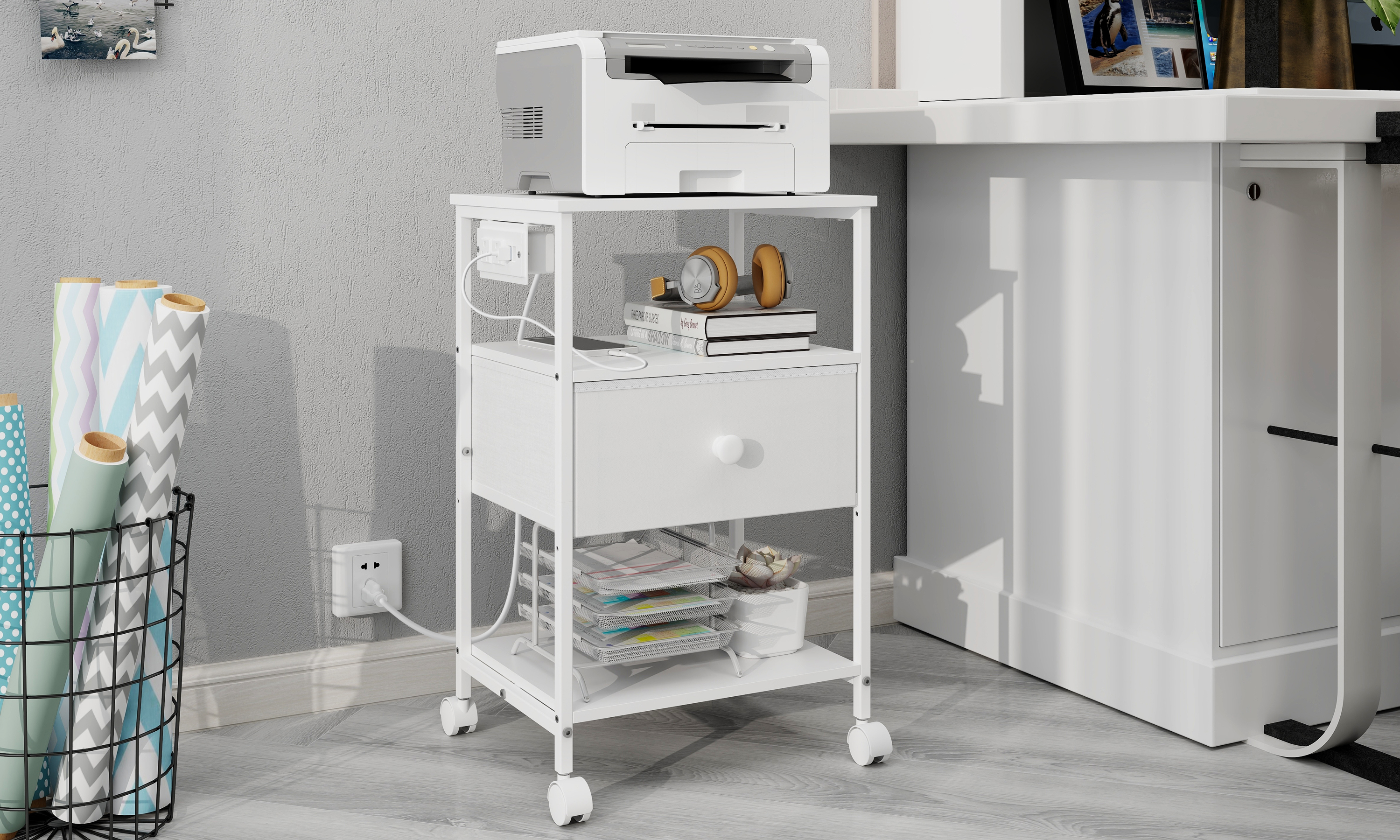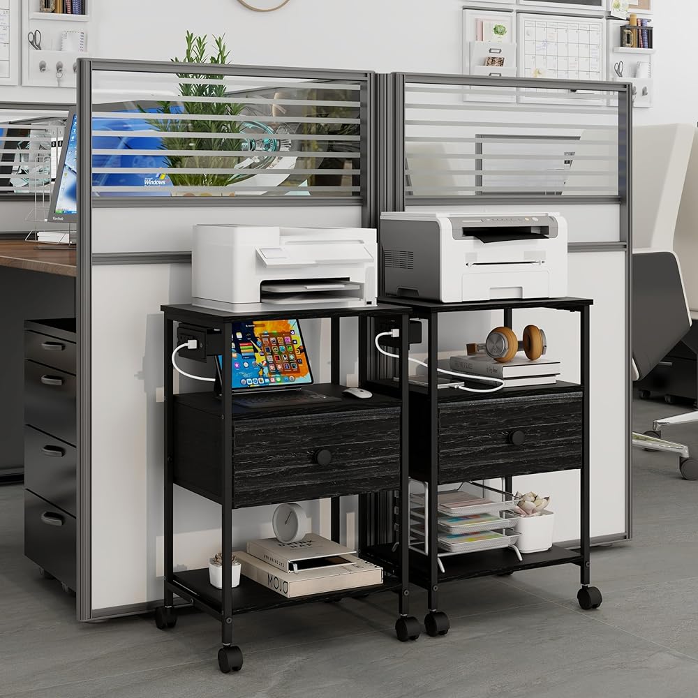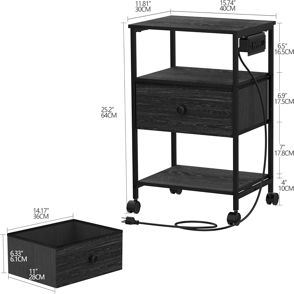 حامل طابعة VEDECASA ذو 3 طبقات مع محطة شحن، ومنفذ USB، وطاولة طابعة مع أدراج قماشية للتخزين، ورف مفتوح قابل للتعديل، للمكتب المنزلي، والنوم، وغرفة المعيشة، بني (أسود)