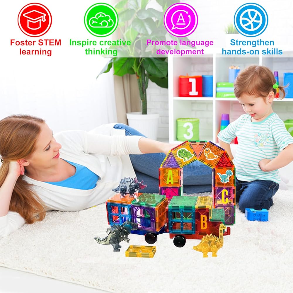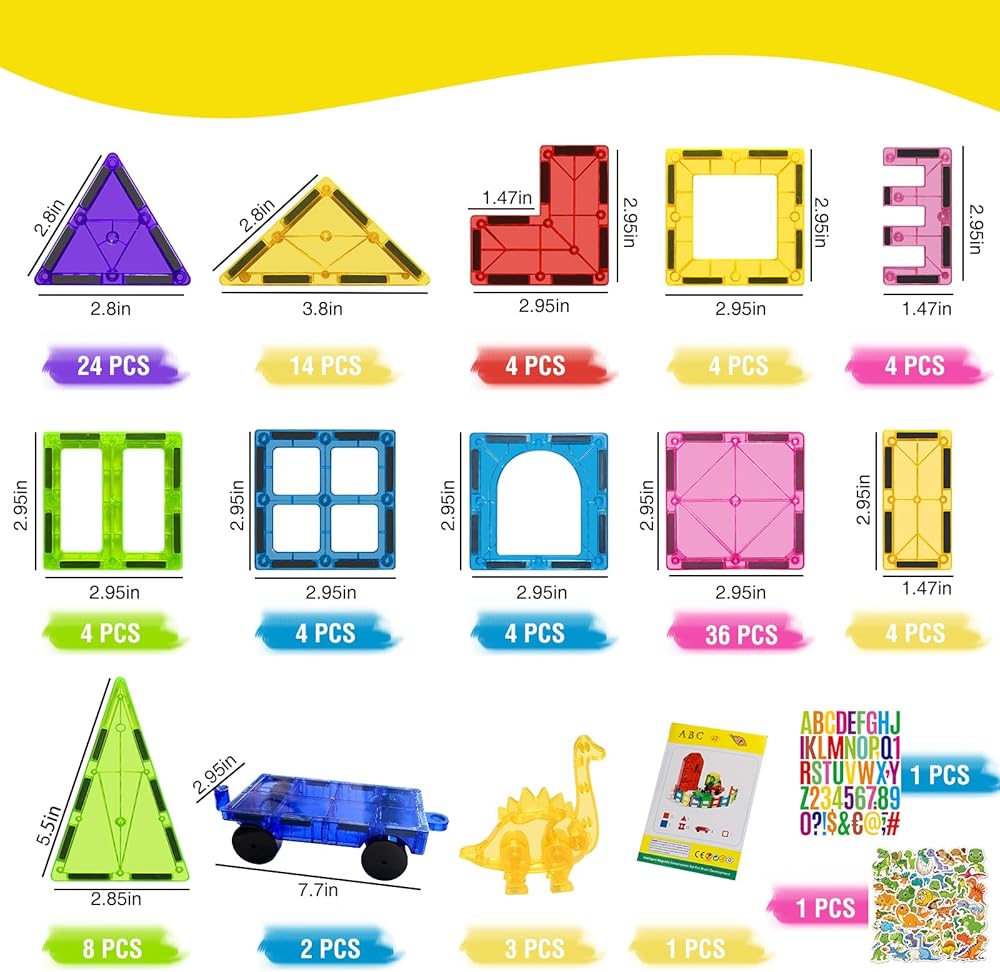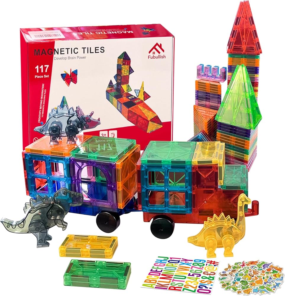 【What You Get】 117 PCS magnet tiles set comes with more pieces and no useless plastic blocks. This magnetic building block set contains 110 PCS magnet tiles, 3 PCS of magnetic dinosaurs, 2 PCS of magnetic cars, 1 ABC alphabet and 50 dinosaur stickers for added fun.