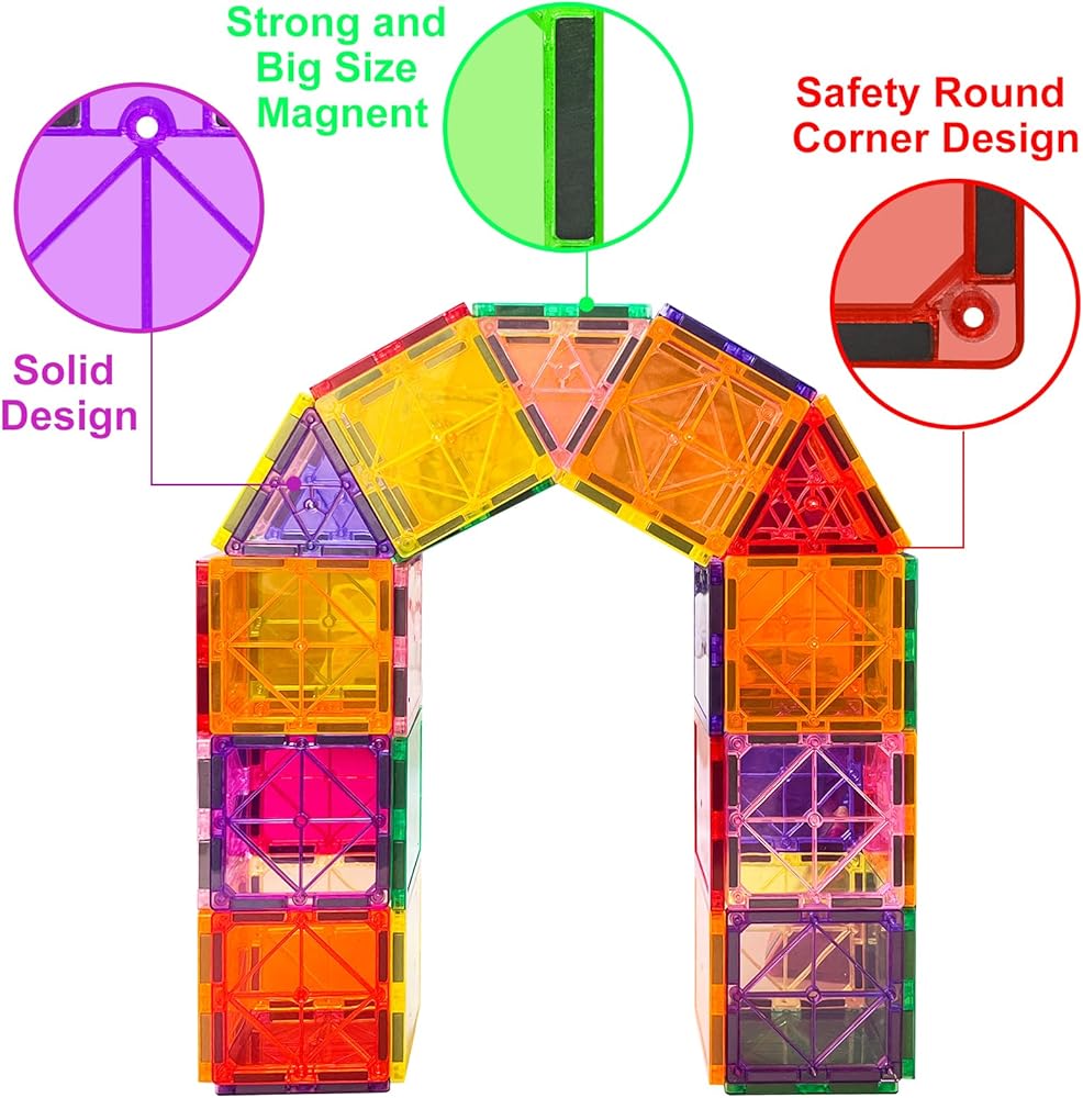 【Safe and Durability】Safety is and always will be our top priority. Our Magnetic tiles are made of Non-Toxic and durable ABS plastic. A smooth surface round edge design won't scratch or hurt little hands. The magnetic blocks are sealed to keep the tiles from breaking or swallowing. Ultrasonic welding technology, better tightness, magnet is not easy to fall off, let your kids release their endless creativity and free their imagination.