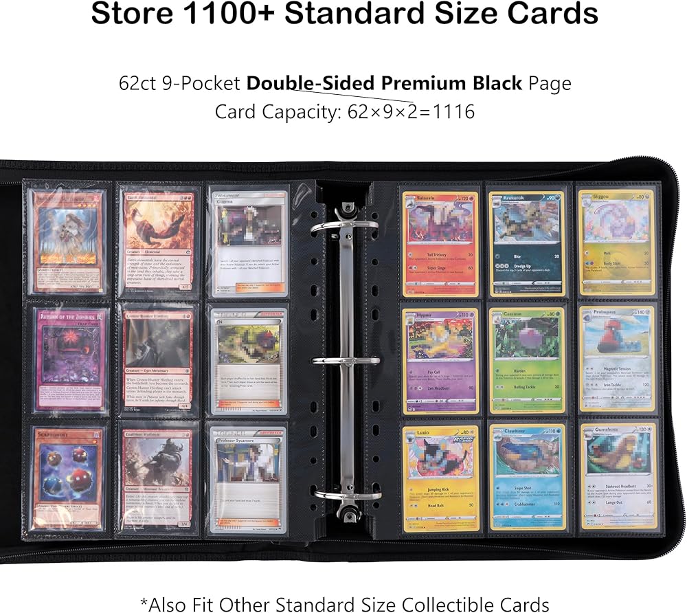Max Storage: Holds 1116 trading cards, includes 62 9-pocket double sided pages. Protect and showcase your trading & sports cards, post cards, memorabilia photos and documents with the highest standard in safe storage.