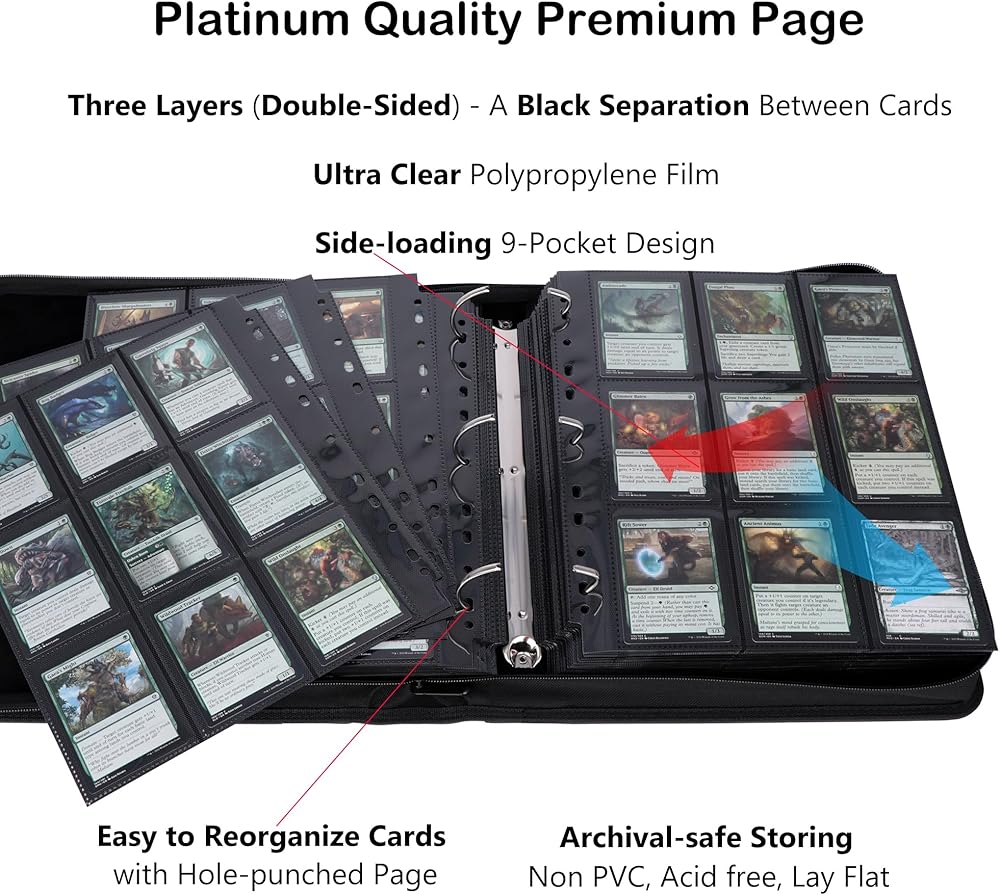 Premium Pages:Double sided low-friction black backing, creating a separation between the front and back pockets, as well as providing cards a classic framed look.