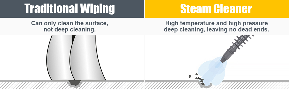 【درجة حرارة عالية وضغط】مع طاقة عالية 1200 واط لتوليد درجة حرارة عالية 100 درجة مئوية - 150 درجة مئوية، بخار ضغط يصل إلى 3.0 بار، يزيل الأوساخ الدهنية العنيدة والمواد الضارة بفعالية.