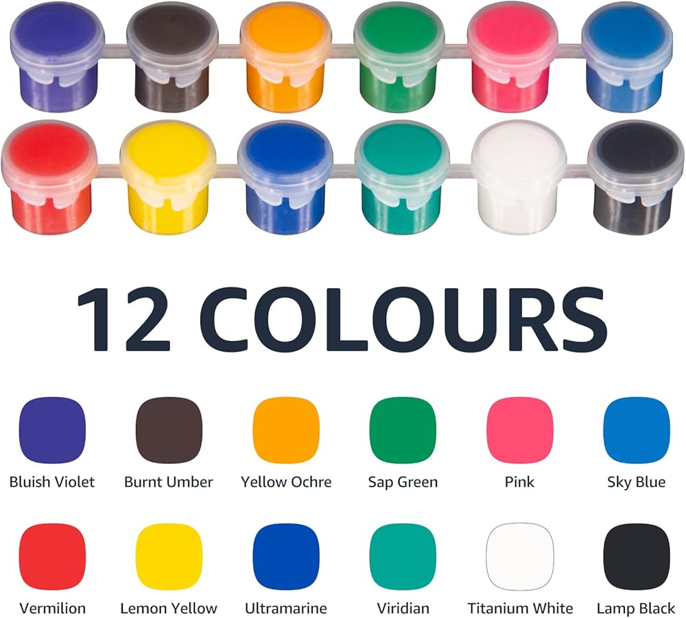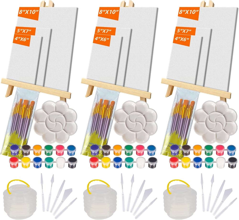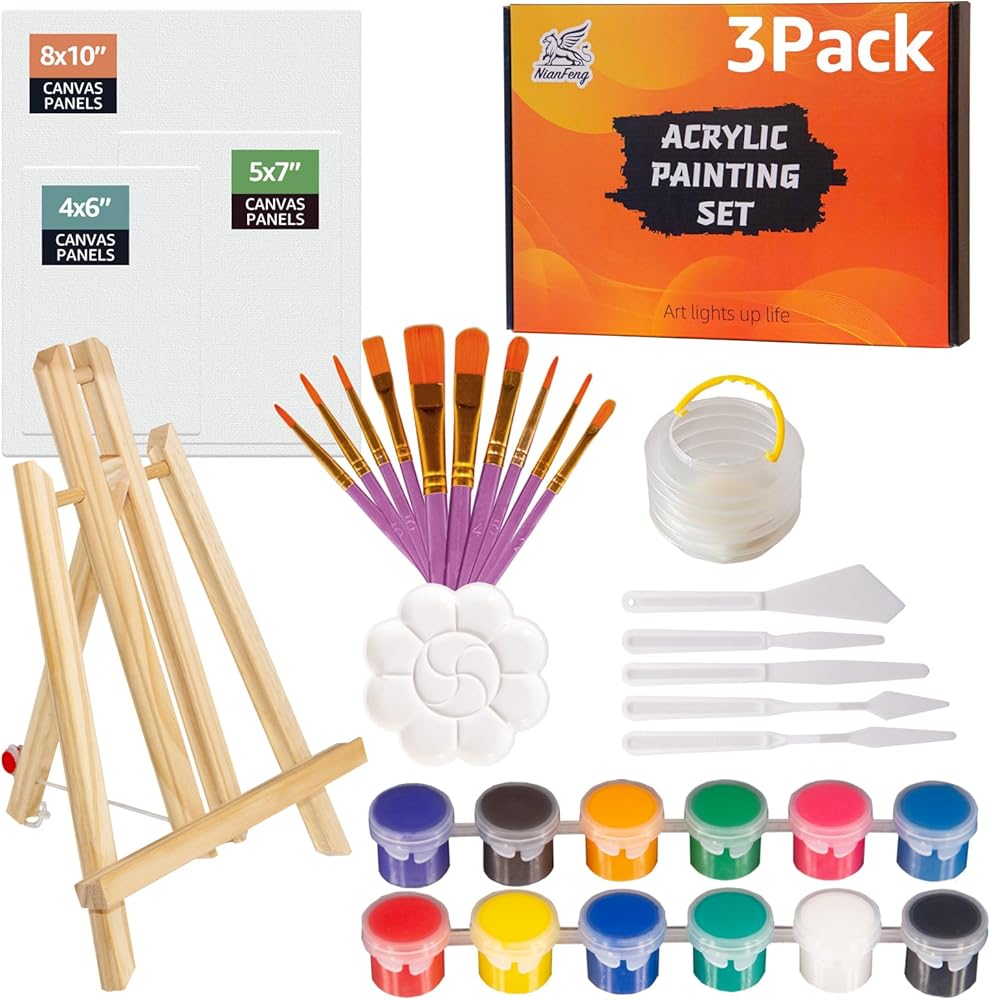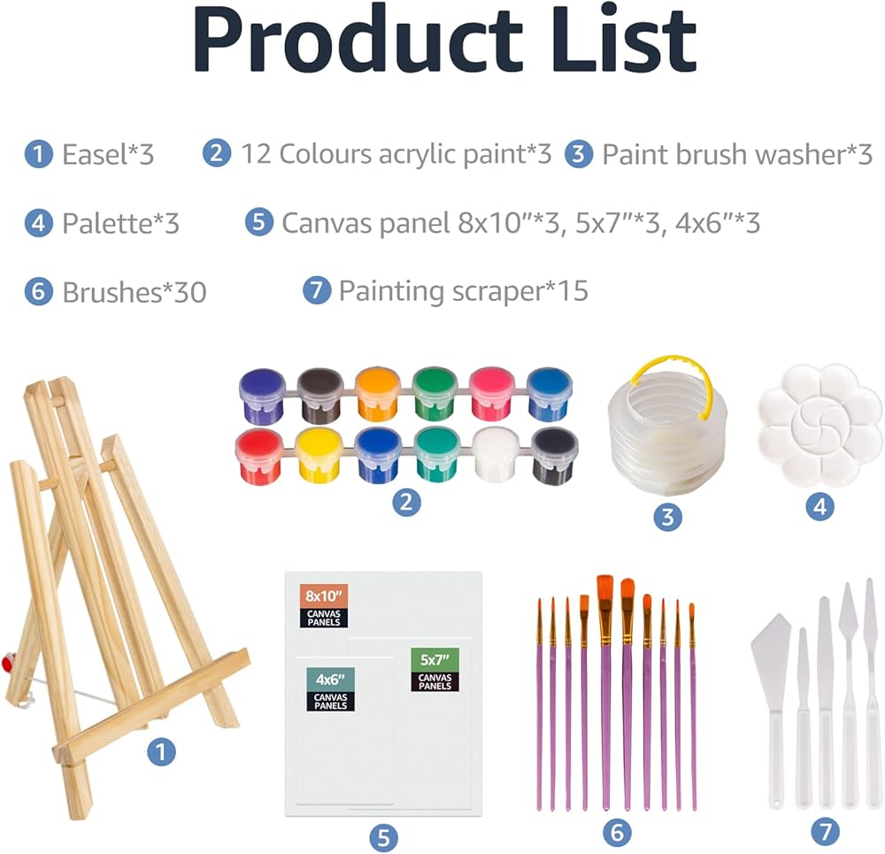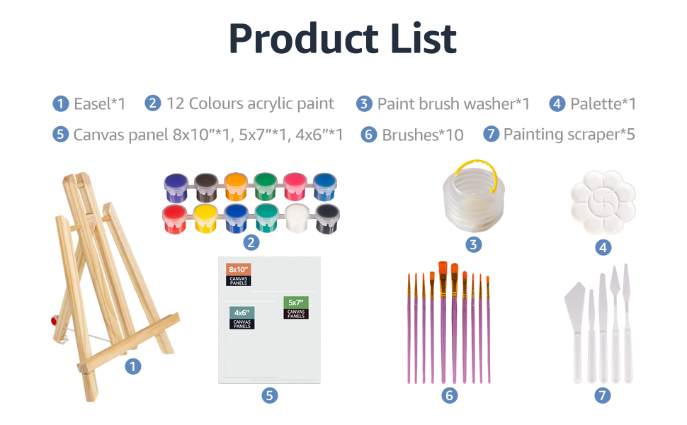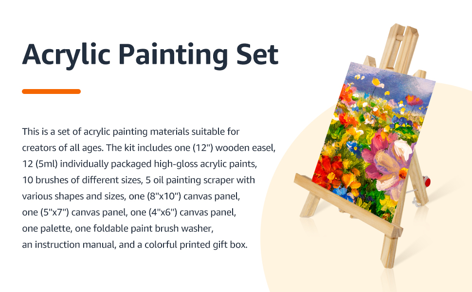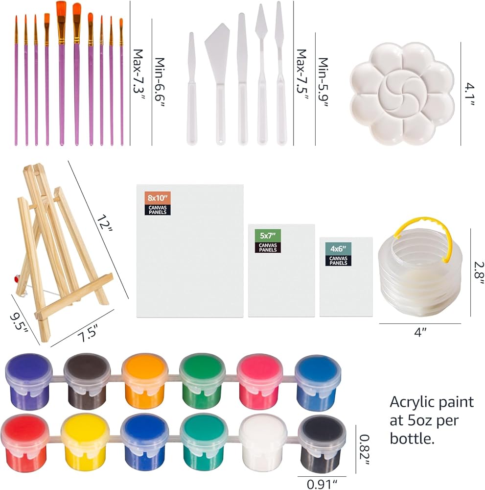 • مزيج مثالي: هذه مجموعة من مواد الطلاء الأكريليك مناسبة للمبدعين من جميع الأعمار. تشتمل المجموعة على حامل خشبي واحد (12 بوصة)، و12 (5 مل) طلاء أكريليك عالي اللمعان معبأة بشكل فردي، و10 فرش بأحجام مختلفة، و5 مكشطة للرسم الزيتي بأشكال وأحجام مختلفة، وقطعة قماش واحدة (8 × 10 بوصة) لوحة، لوحة قماشية واحدة (5x7 بوصة)، لوحة قماشية واحدة (4x6 بوصة)، لوحة واحدة، غسالة فرشاة طلاء قابلة للطي، دليل تعليمات، وصندوق هدايا مطبوع ملون.