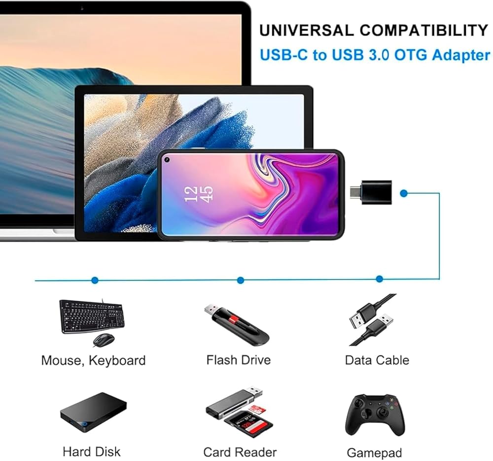 توافق واسع: محول من النوع C إلى USB متوافق مع الكمبيوتر المحمول/الكمبيوتر اللوحي/الهاتف الذكي مع منفذ USB من النوع C. يتيح لك المحول من النوع C إلى USB توصيل ملحقات/كابلات USB القياسية بمنفذ من النوع C. يدعم المحول أيضًا تقنية OTG للهواتف الذكية.