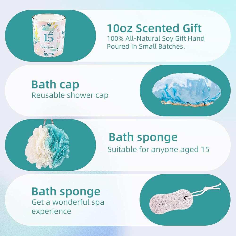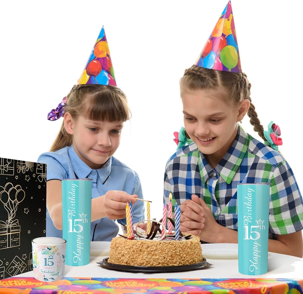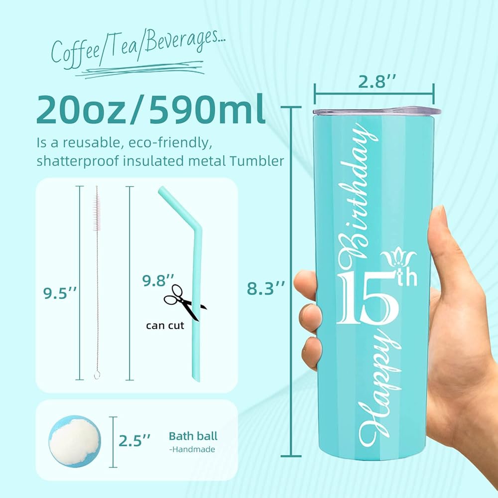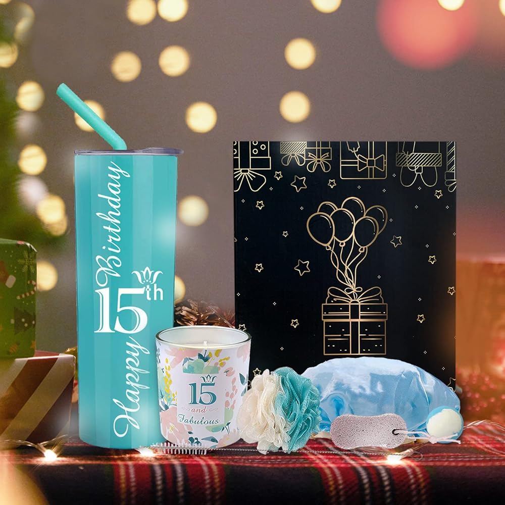 • هدية عيد الميلاد الخامس عشر: كوب "عيد ميلاد سعيد الخامس عشر" بوزن 20 أونصة لعيد الميلاد الخامس عشر مع ماصة وفرشاة تنظيف، هدية عيد ميلاد خامس عشر، كرات استحمام مصنوعة يدويًا. قبعة استحمام قابلة لإعادة الاستخدام، حجر خفاف طبيعي للقدمين، إسفنجة استحمام. مجموعة هدايا مثالية لحفلات عيد الميلاد الخامس عشر لأي شخص يبلغ من العمر 15 عامًا. إنها الهدية المثالية لاحتفال فتاة عيد الميلاد الخامس عشر