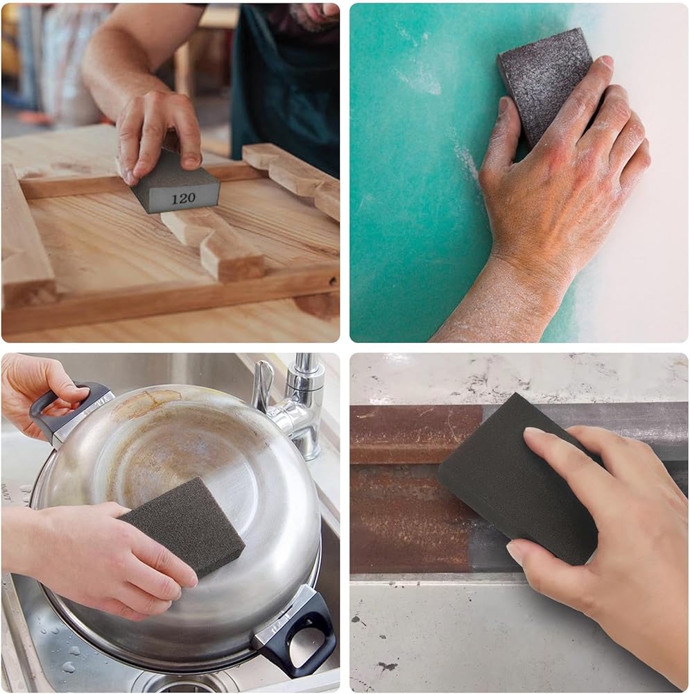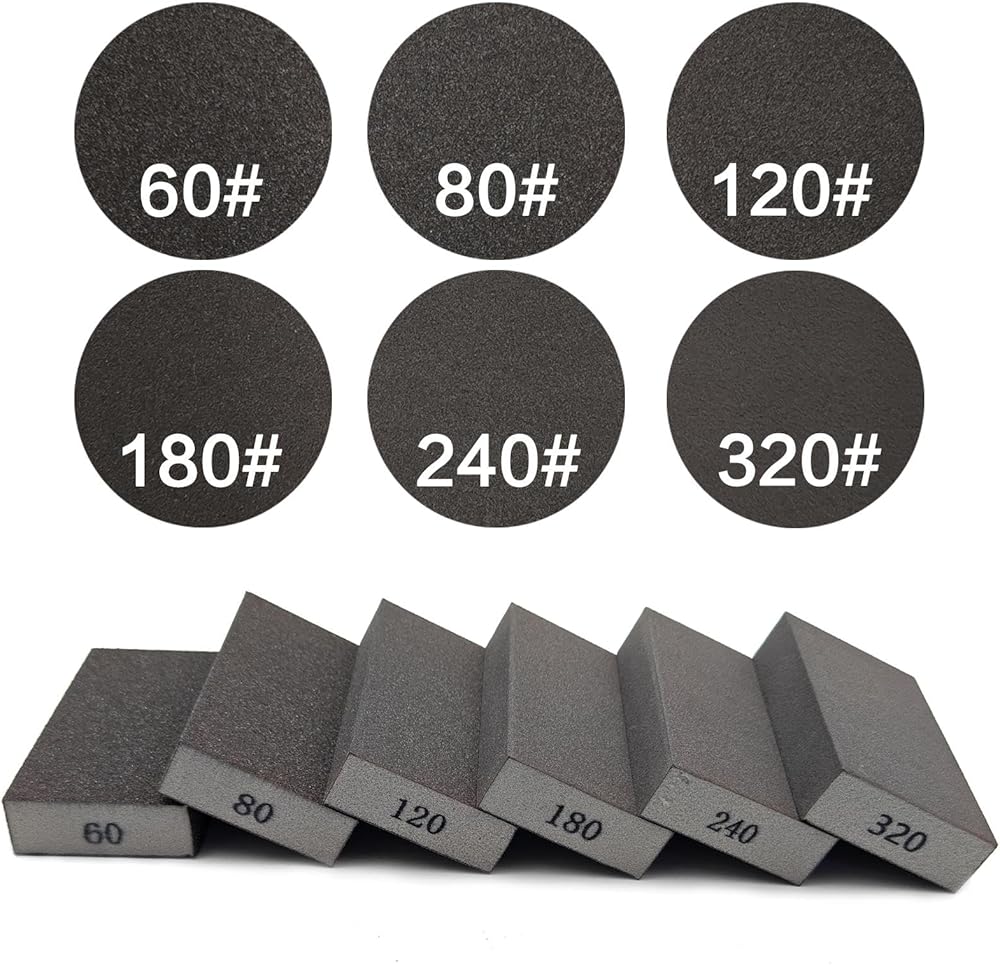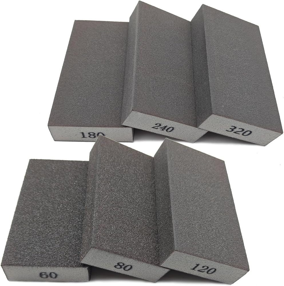 Sanding Block Set: Sponge Assortment Packed with 6 different grit abrasive sand blocks from coarse to fine 60 80 120 180 240 320 grit. Each sandpaper block is 4.84 x 2.75 x 0.98 inches. Our sanding block set is perfect for various projects. Whether you are sanding wood, polishing furniture, or removing paint from surfaces like drywall or glass, our sanding blocks deliver exceptional results.