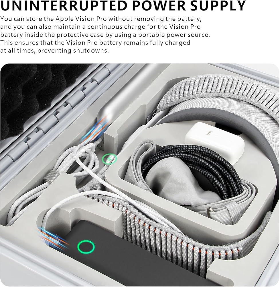 We have paired the vision pro with some accessories needed for daily use in our case to help you better use the Vision Pro, What you get: 1 * Apple Vision Pro Hard Case, 1* 10FT 65W charging cable, 1* Screen cleaning cloth, 1* Glasses Dust Cover, 1* Power cord velcro strap, 1* Velvet bag.