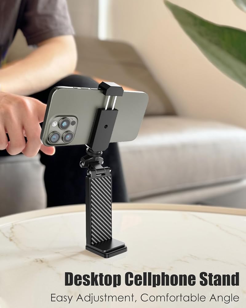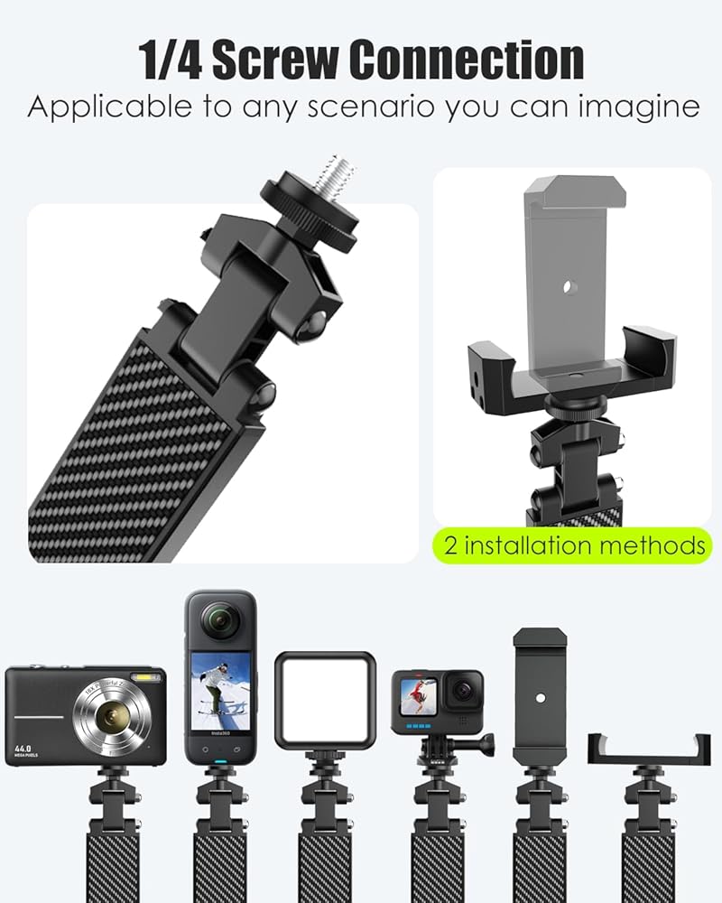 【خيط عالمي 1/4 بوصة】يحتوي حامل الهاتف على خيط قياسي 1/4 بوصة في الجزء العلوي، يمكنك ربط هذا الحامل بجميع الأجهزة ذات الحجم العادي، وفلاش LED، والكاميرات الصغيرة، والميكروفونات وغيرها من الملحقات. يحتوي مشبك الهاتف المحمول على خيارين للتثبيت: بالأسفل وبينهما، لمزيد من أفكار التثبيت.