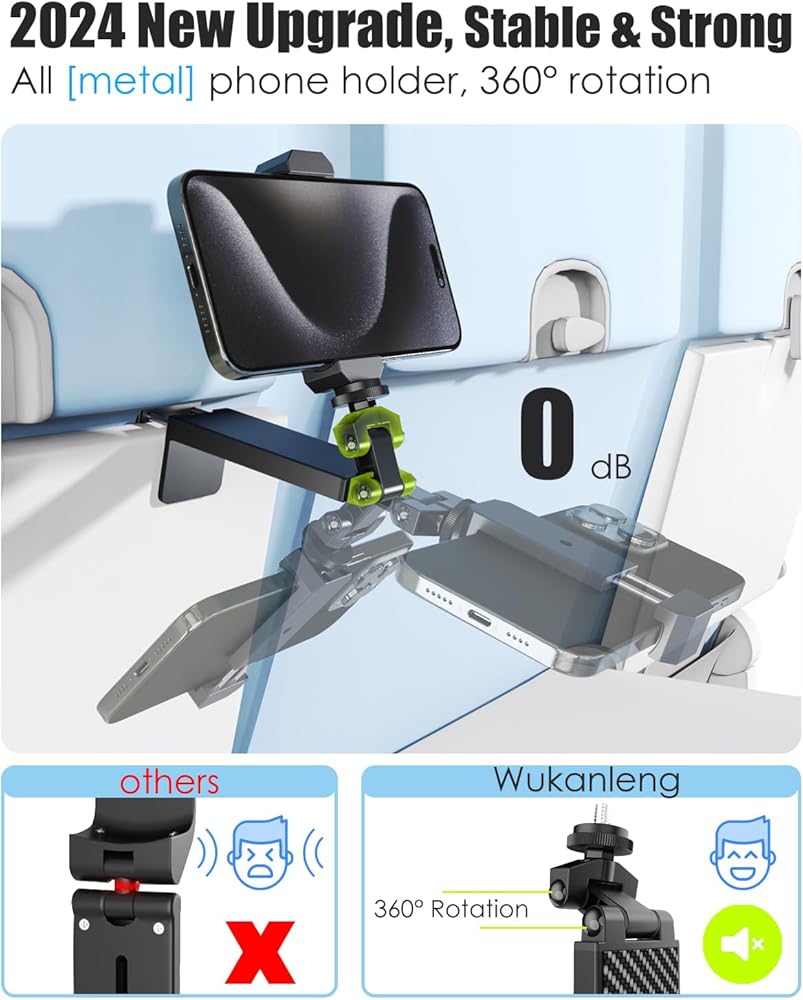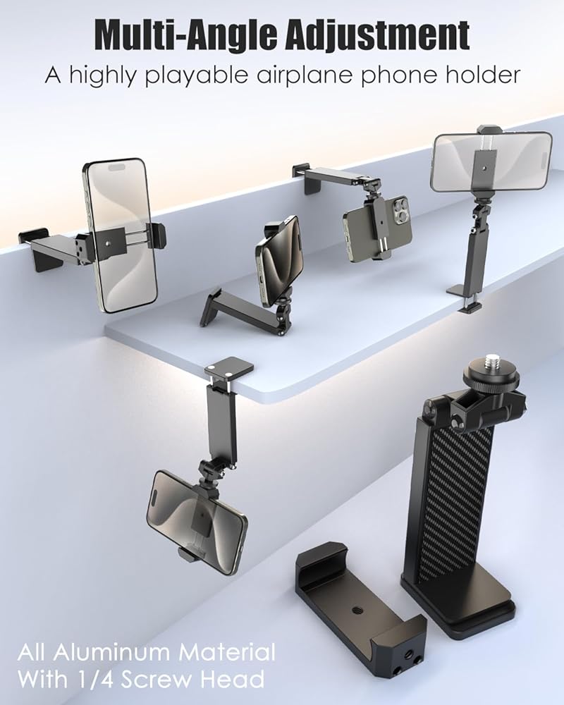 حامل هاتف معدني على شكل طائرة مع برغي 1/4 بوصة، يجب أن يكون للسفر المُحسن لعام 2024 حامل بمشبك هاتف لدوران 360 درجة بدون ضوضاء متوافق مع هواتف iPhone 15 Pro Max و4-7 بوصة
