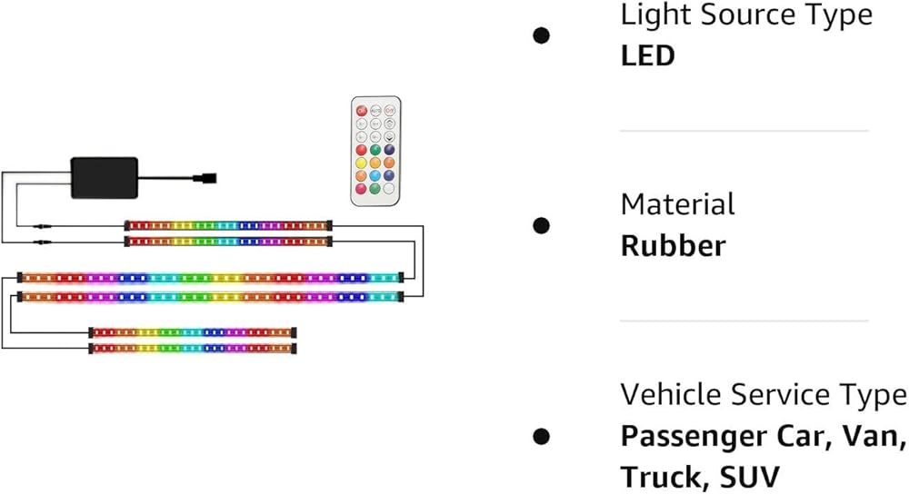 التوافق العالمي - الجهد الكهربي 12 فولت يعني أنه يمكن استخدامه في جميع أنحاء السيارة تقريبًا. مثالية للسيارات وسيارات الدفع الرباعي والشاحنات والشاحنات وتزيين القوارب. وكإضاءة تزيينية، يمكن استخدامه أيضًا لتزيين منزلك أو حديقتك أو حفلتك أو أي مكان تريده.