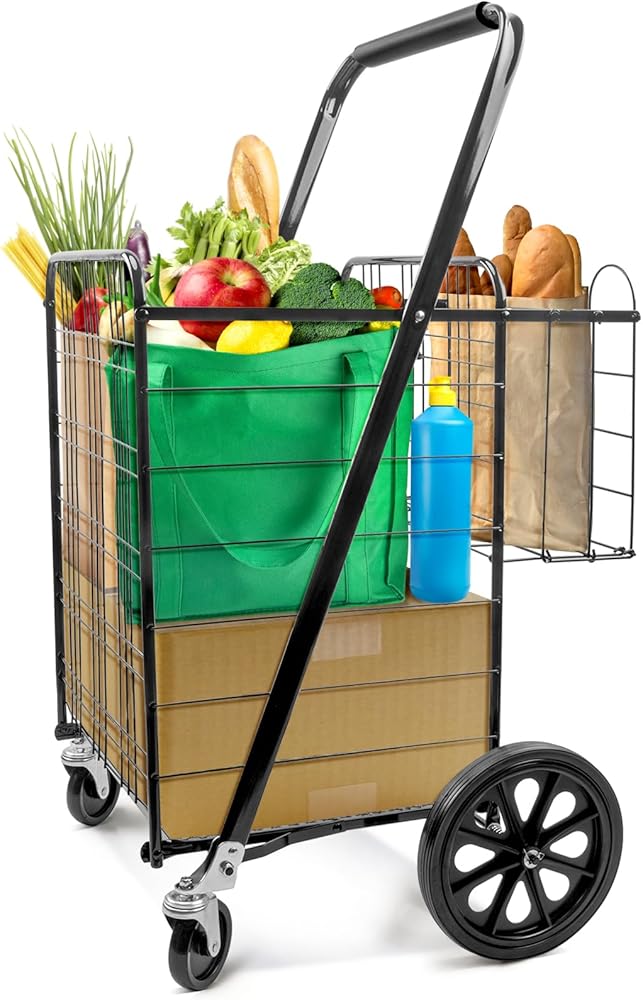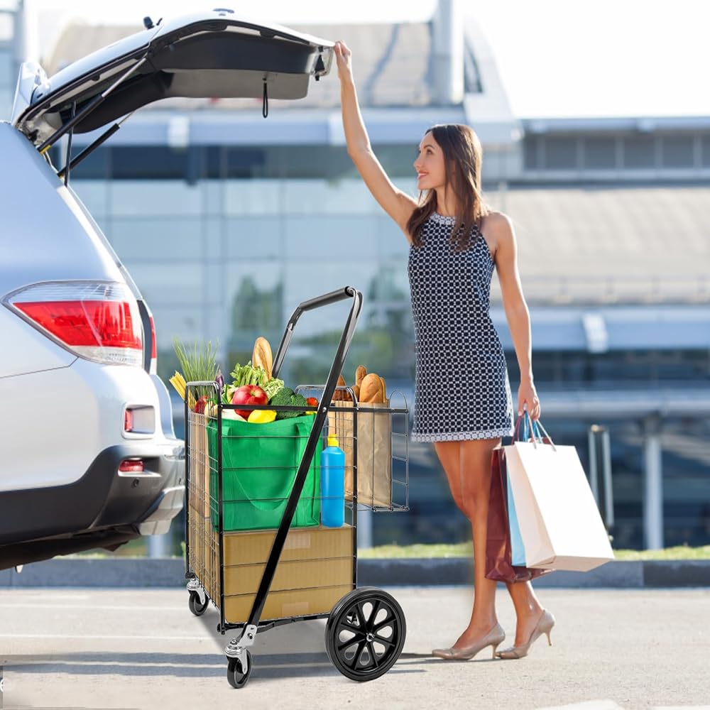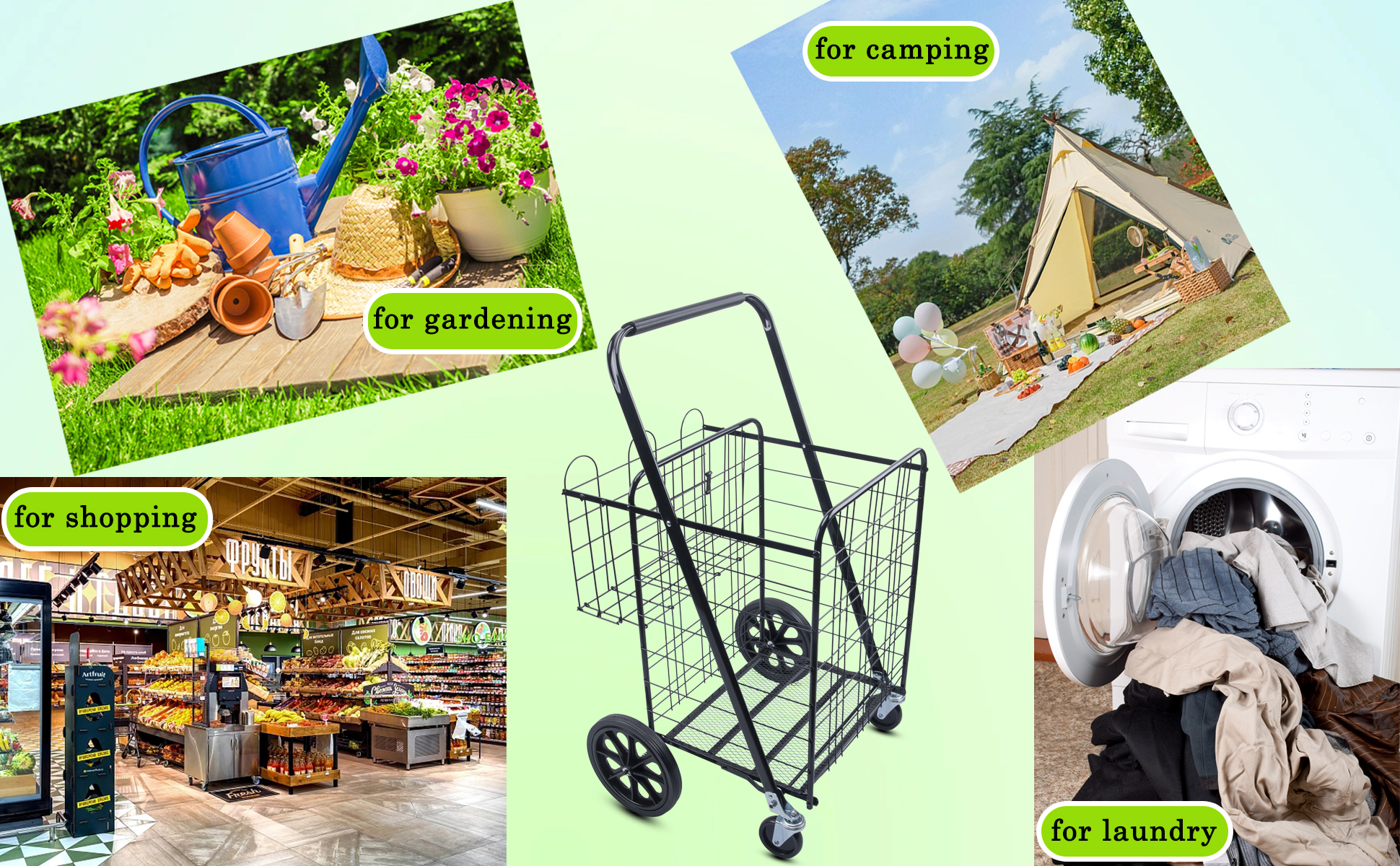 • 【عربة تسوق متعددة الأغراض】تُستخدم عربة التسوق القابلة للطي هذه لأغراض مختلفة، بما في ذلك نقل العناصر من الغسيل والبقالة إلى معدات التخييم وأدوات البستنة والملفات المكتبية وحقائب السفر وزجاجات المياه والمعدات الرياضية ومعدات الشاطئ ومستلزمات المطبخ.