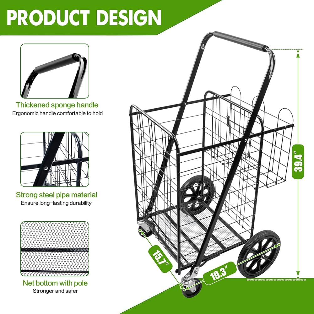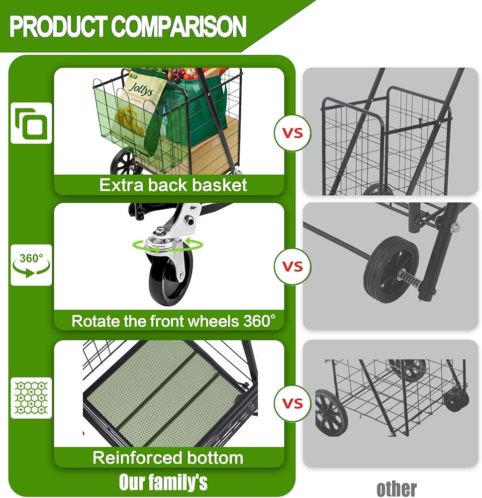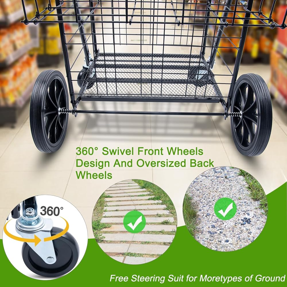 • 【تصميم عجلات أمامية دوارة 360 درجة】تتميز عربة التسوق هذه للبقالة بتصميم عجلات أمامية دوارة 360 درجة وعجلات خلفية كبيرة الحجم، مما يضمن القدرة على المناورة المثالية. تسمح لك العجلات الأمامية الدوارة بالتنقل بسهولة وتغيير الاتجاه على الأرصفة الوعرة، مما يجعل من السهل تحريك عربة التسوق هذه.