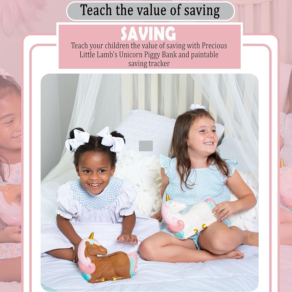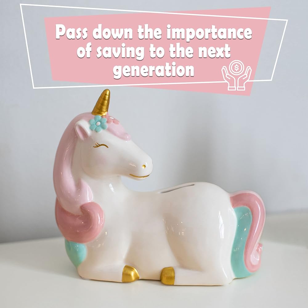 تعليم قيمة الادخار. إن درس توفير المال سوف يدوم طفلك مدى الحياة. علمهم أن يفخروا بالادخار مع بنك المال يونيكورن للأطفال. أضف مدخرات طفلك الأولى إلى بنوك الأطفال الجميلة والساحرة على شكل وحيد القرن للفواتير والعملات المعدنية.