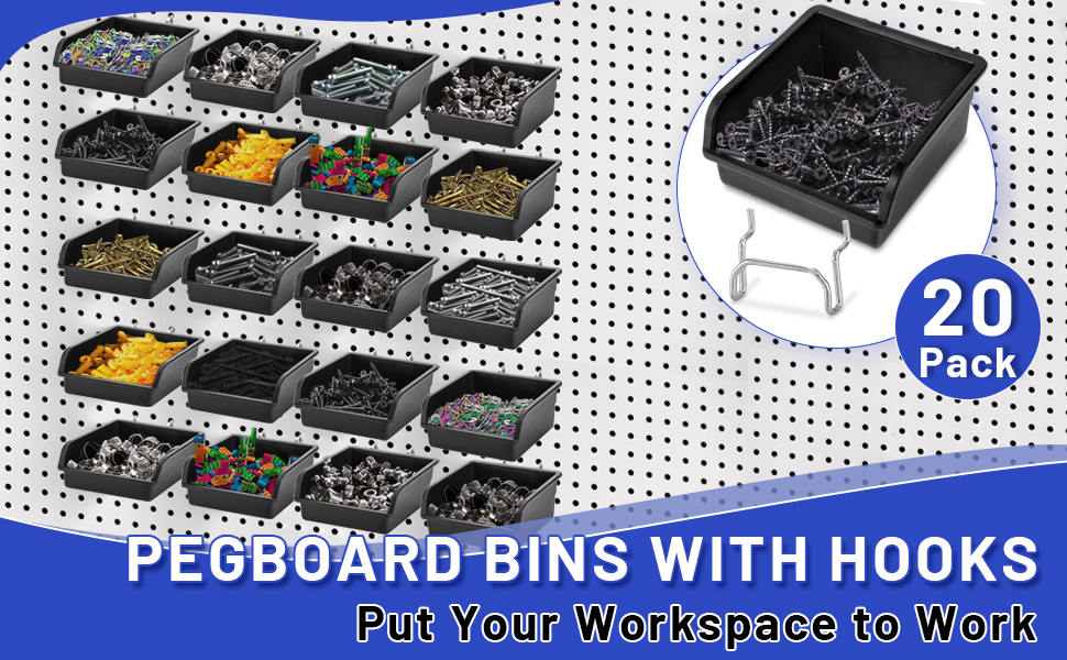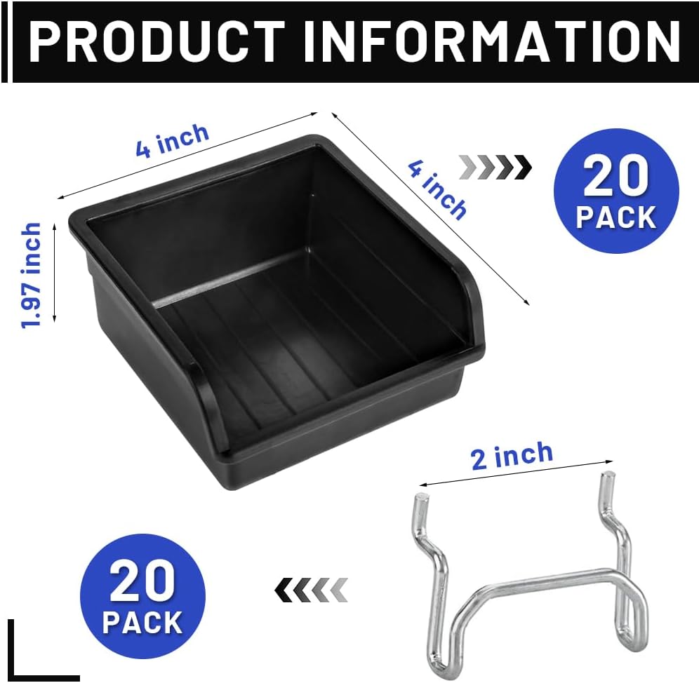 20 عبوة من صناديق Pegboard مع خطافات معدنية، وملحقات تنظيم لوحة Pegboard السوداء، وصناديق تخزين مثبتة على الحائط لتنظيم أدوات الأجهزة المكتبية، ورشة عمل المرآب