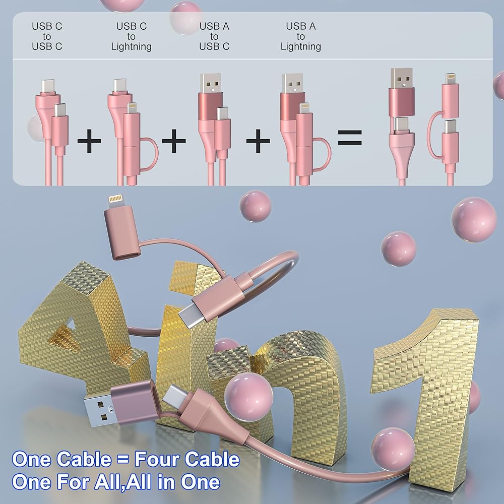 كابل ملفوف USB C إلى Lightning 4 في 1، PD 60W للشحن السريع ومزامنة البيانات، كابل شحن متعدد 6FT لـ Apple CarPlay وAndroid Auto، USB/USB C إلى USB C/Lightning Cable Combo لهاتف iPhone/Pad/Android، وردي