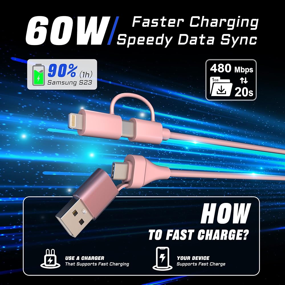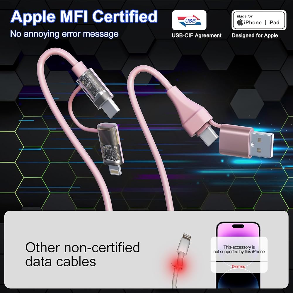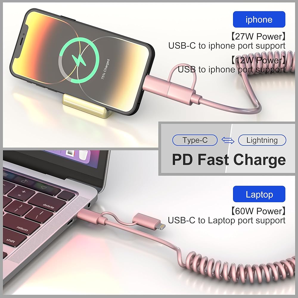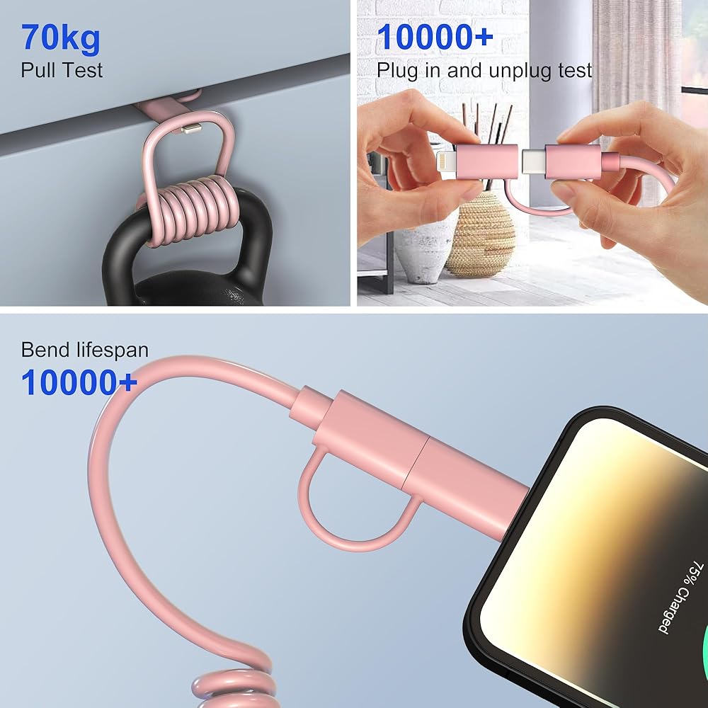 كابل بيانات 4 في 1: محول USB إلى USB C هذا هو حل كابل واحد يجعل من السهل شحن ومزامنة أجهزة Lightning أو USB C الخاصة بك. كابل Lightning ملفوف 4 في 1 للسيارة يأتي مع أطراف قابلة للتبديل لتناسب مجموعة متنوعة من الأجهزة، ويدعم USB A إلى C، وUSB A إلى Lightning، وUSB C إلى Lightning، وUSB C إلى USB C بأربعة أوضاع.