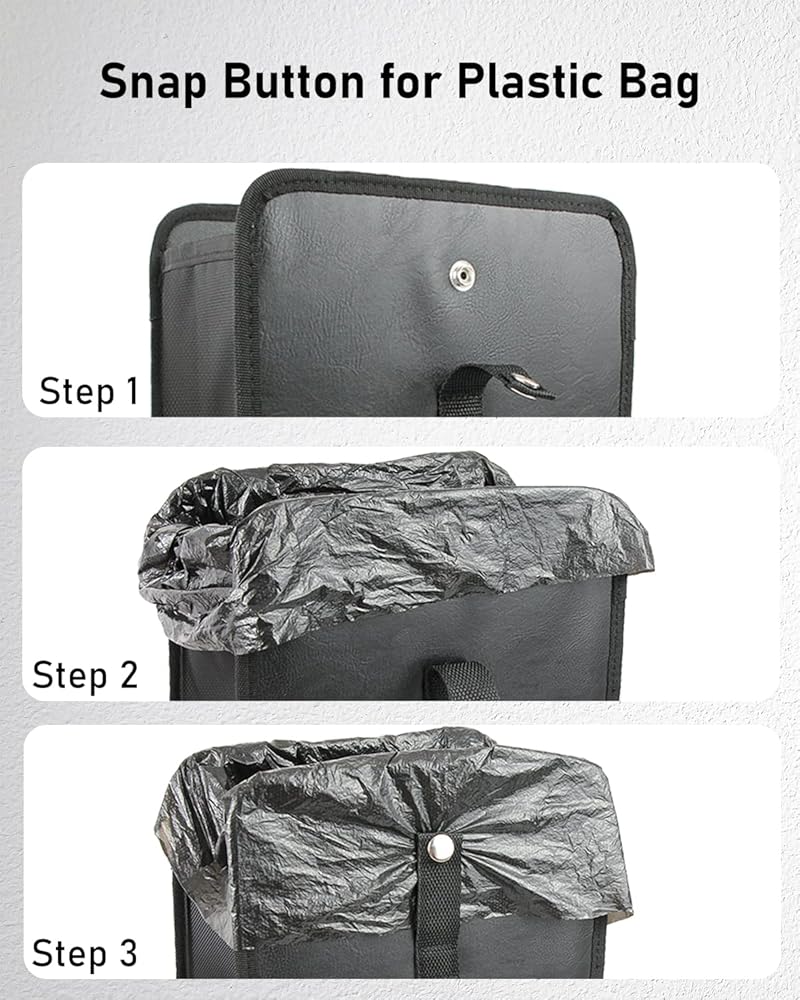 قابلة للطي للتخزين: يمكن تخزين سلة قمامة السيارة بسهولة ويمكن طيها بشكل مسطح لتناسب المقعد عند عدم الاستخدام.