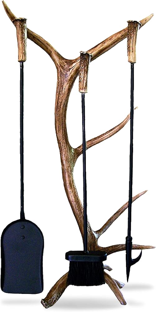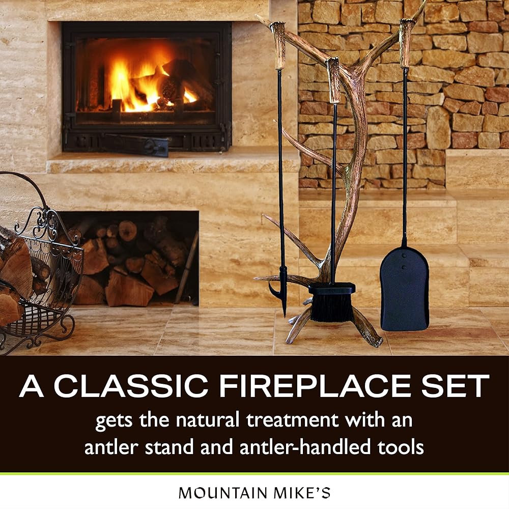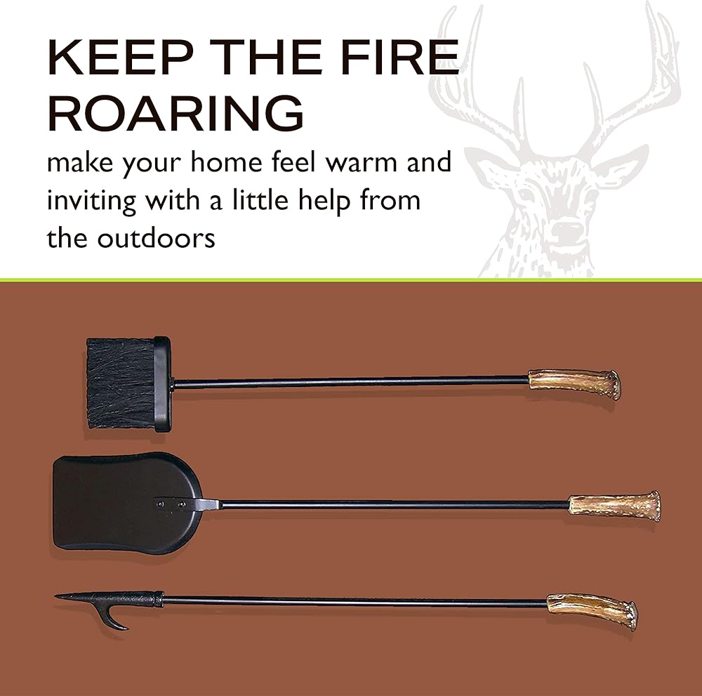 Mountain Mikes - مجموعة أدوات مدفأة قرن الوعل - ديكور مستوحى من الأماكن الخارجية الرائعة - قرون الغزلان والأيل المكررة المتينة - تتضمن مجرفة وفرشاة وبوكر