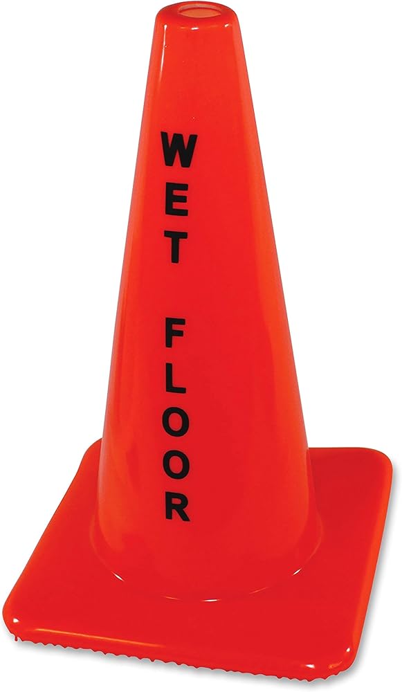 One-piece safety cone provides a convenient way to alert caution around wet areas. "Wet Floor" is printed in black on two sides of the nearly unbreakable cone. Flanges on the base allow air to flow through to prevent it from tipping over. Wide base features a rugged bottom to enhance its grip to the floor. Solid orange color is easily visible even from a distance for increased effectiveness. Weighted base creates a low center of gravity to avoid being knocked over.