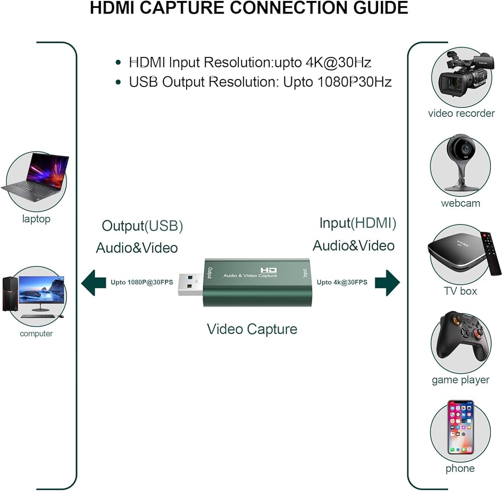 【عالية الوضوح】 يمكن لبطاقة التقاط SROMGEE hdmi التقاط كل من فيديو وصوت HDMI في وقت واحد ونقل إشارات الصوت والفيديو إلى أجهزة الكمبيوتر والهواتف الذكية للمعاينة والتخزين. وبالتالي فإن بطاقة الالتقاط هي وسيلة سريعة واقتصادية لمشاركة المحتوى في قاعات المؤتمرات والاجتماعات عبر الإنترنت من خلال برنامج OBS. يستخدم على نطاق واسع للحصول على دقة عالية، وتسجيل التدريس، والتصوير، والاجتماعات، ومسجل تلفزيون بوابة الفيسبوك وما إلى ذلك.