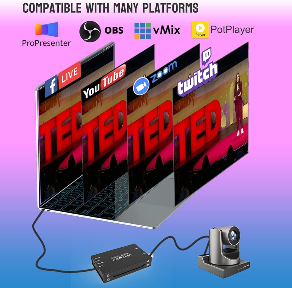 AVKANS Professional USB Capture Card Designed for AVKANS PTZ Camera, PTZoptics PTZ Camera, Avipas PTZ Camera, SMTAV PTZ Camera, Fomako PTZ camera, and BZBgear, Goelectronic/Blackmagic/SONY/Canon/Panasonic PTZ Camera and other SDI HDMI PTZ Cameras in the markets, resolution is up to 1080P@60HZ.