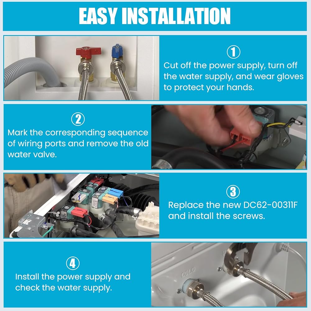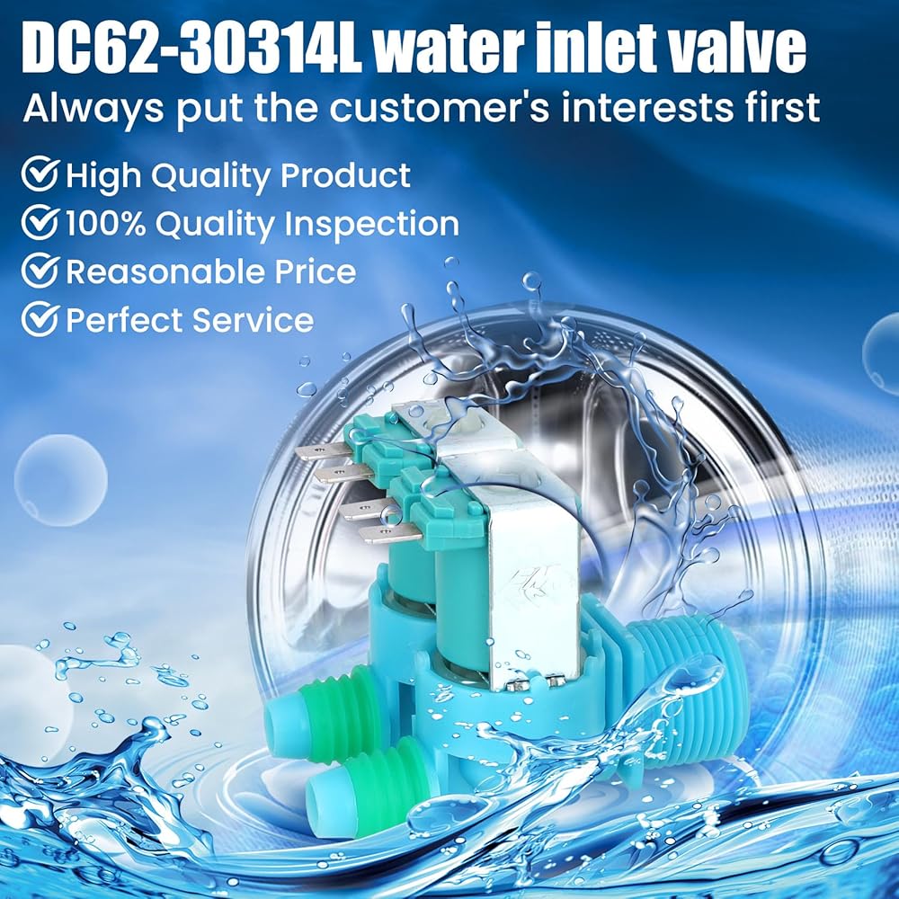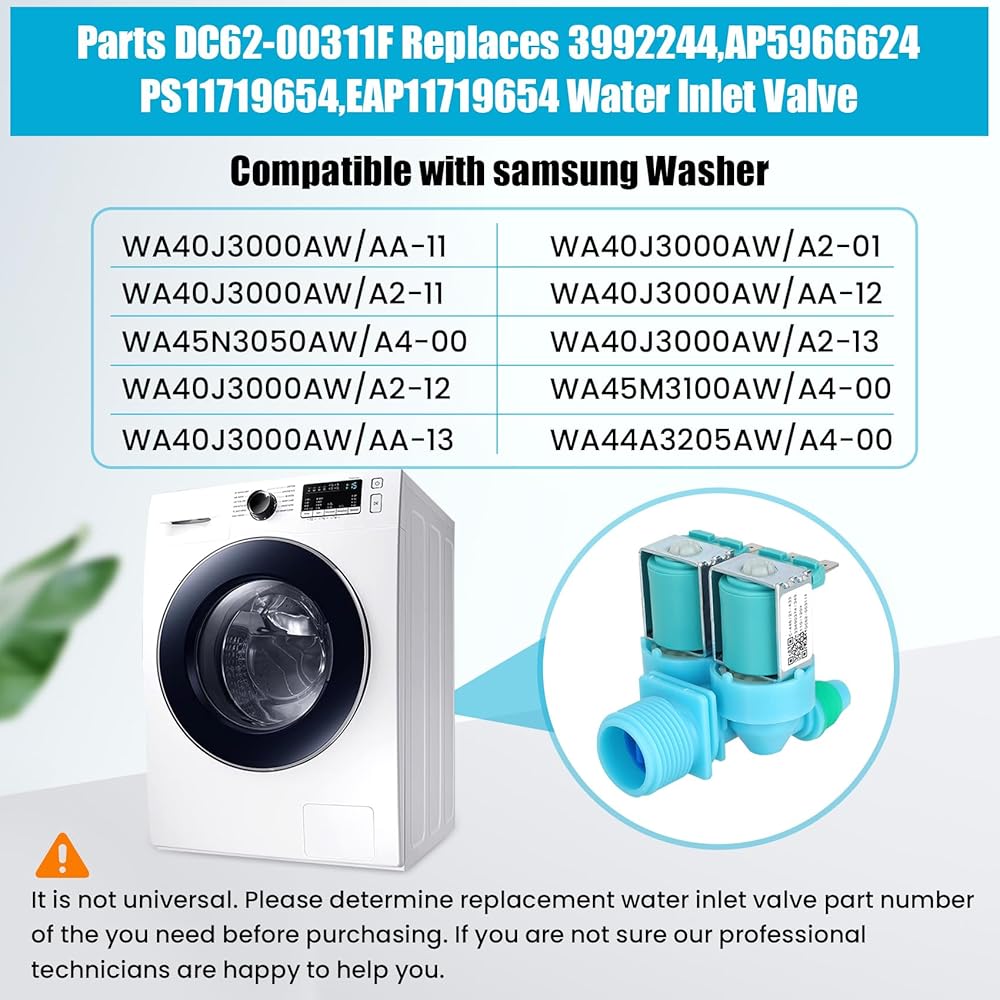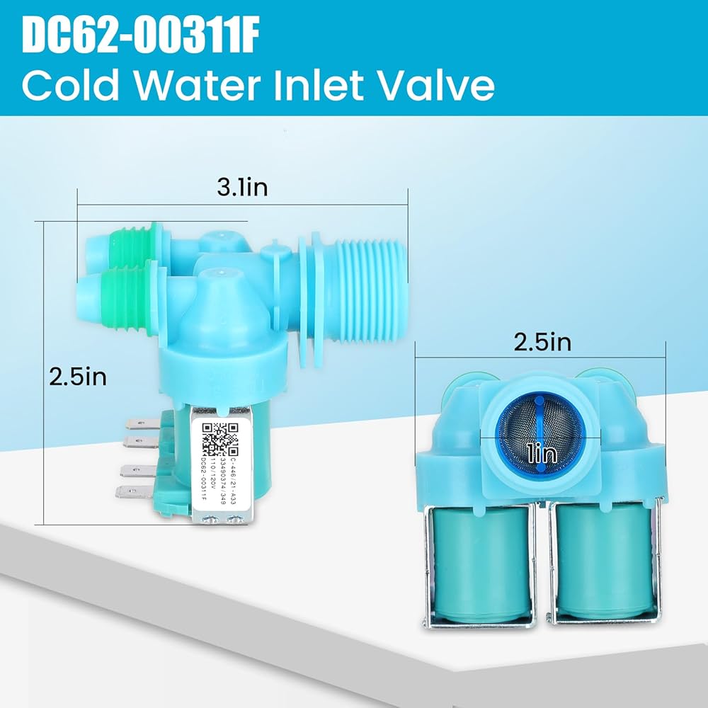 صمام مدخل الماء البارد DC62-00311F متوافق مع غسالة سامسونج WA40J3000AW WA45N3050AW WA44A3205AW، أجزاء DC62-00311F تحل محل 3992244، AP5966624، PS11719654، EAP11719654 صمام المدخل - ضمان لمدة عام
