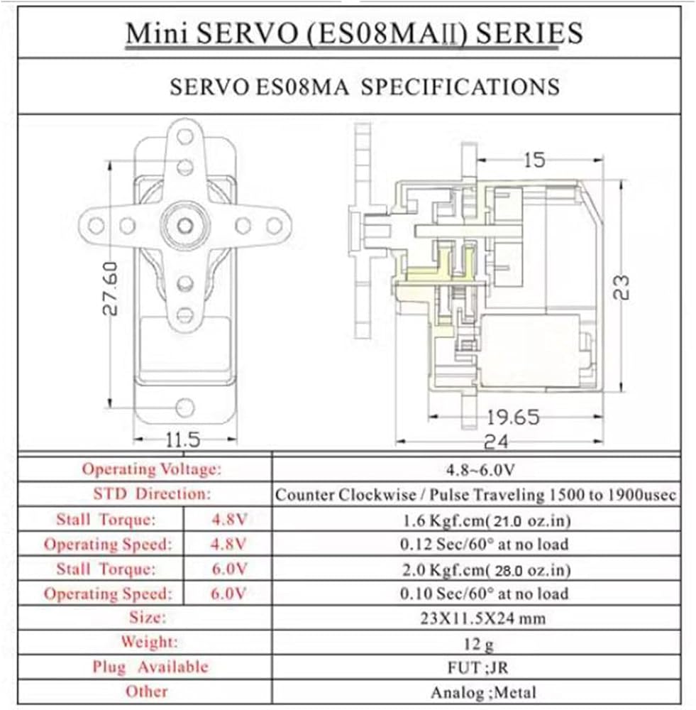 ES08MAII Servo:Metal Gear;Maximum torque is up to 2 kg/cm (6V);Voltage Input: 4.8 - 6V