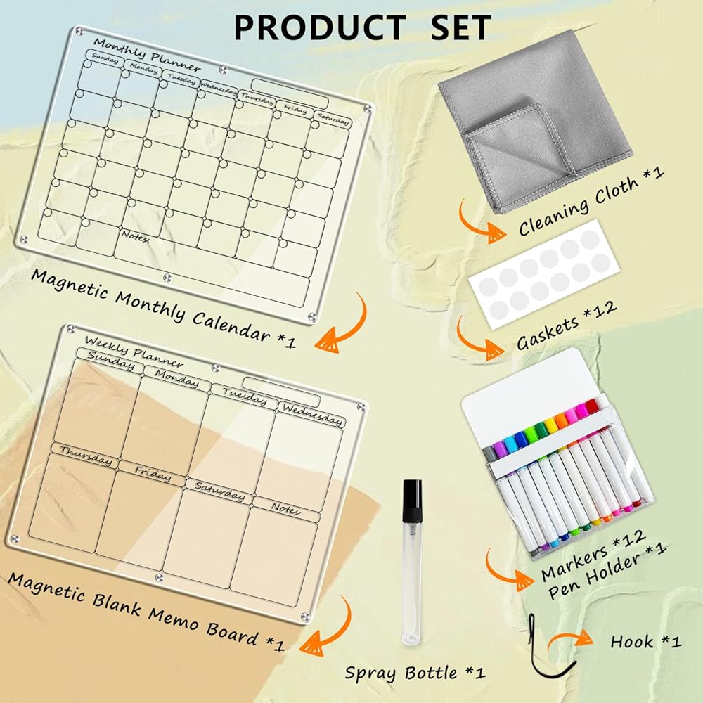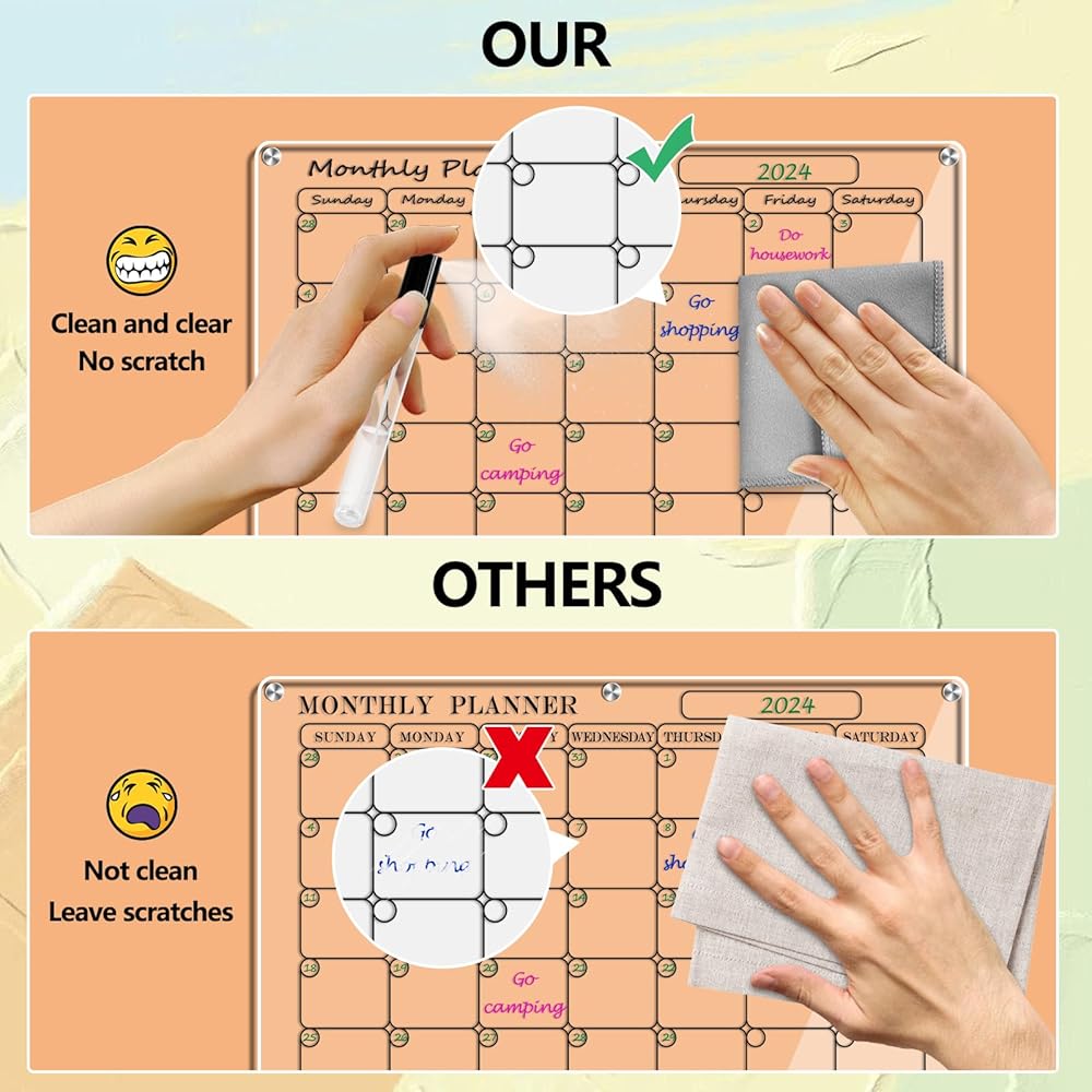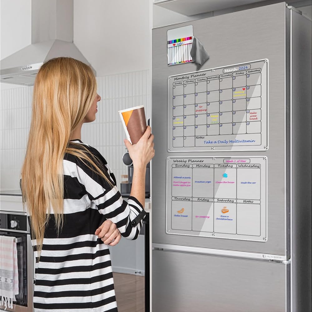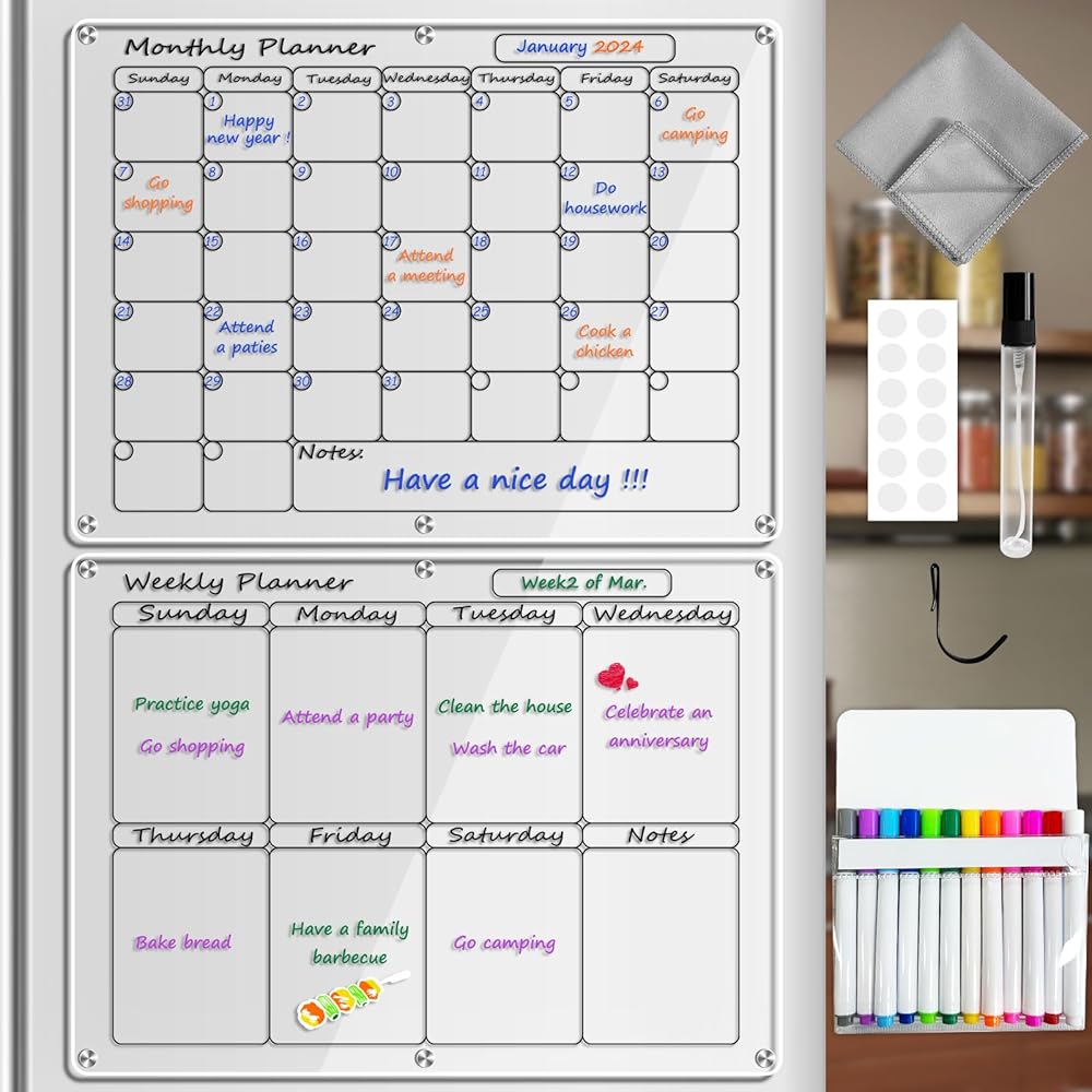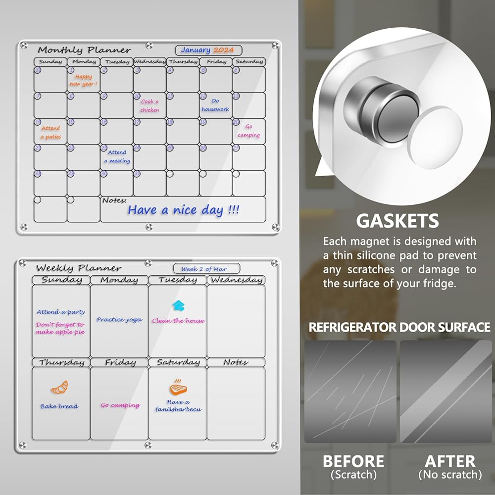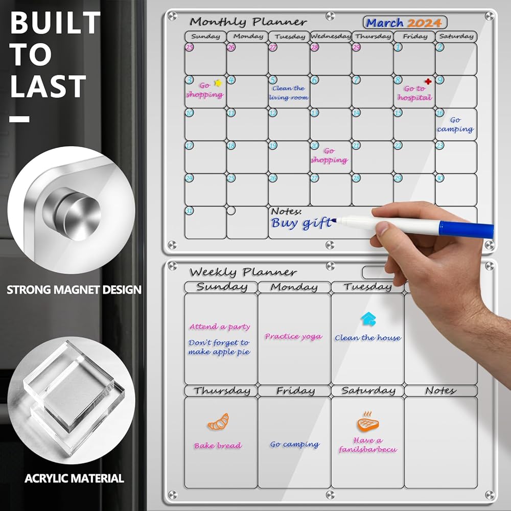 • مادة أكريليك فاخرة وتصميم بسيط: مصنوعة من مواد فاخرة عالية الشفافية، توفر مجموعة التقويم الأكريليك هذه مظهرًا واضحًا وأنيقًا دون المساس بجمالية منزلك. مثالية لتنظيم جدولك الزمني وإضافة لمسة من الرقي إلى مساحة معيشتك.