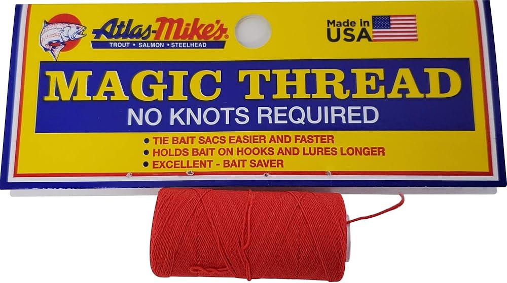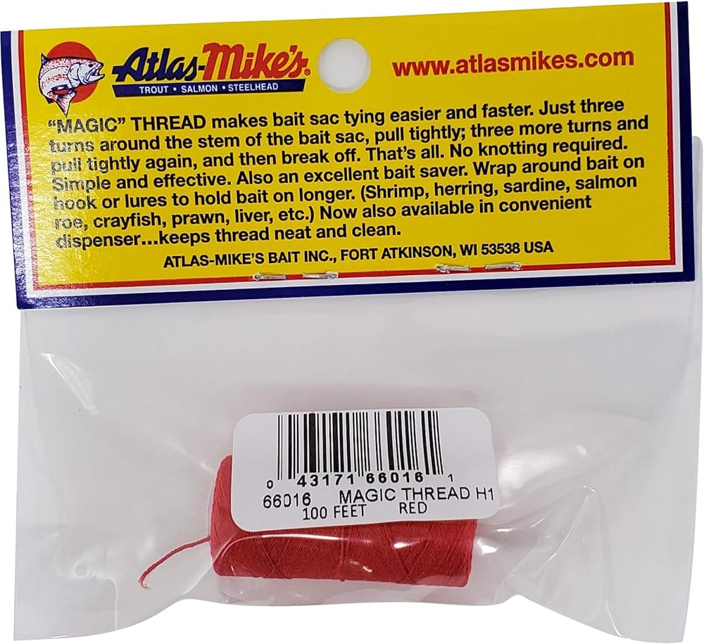 Secure your bait with ease using Atlas Mike's Two Magic Thread in Red. This 100-foot spool of strong, versatile thread is essential for every tackle box. It's designed to hold your bait firmly in place without knots, simplifying the baiting process. The vibrant red color adds an extra visual attractant that can trigger more bites, making it particularly effective for salmon, steelhead, and trout fishing. Ideal for use with a variety of baits including shrimp, herring, and other soft baits, the Atlas Mike's Magic Thread is a must-have for both novice and experienced anglers aiming to enhance their fishing success.