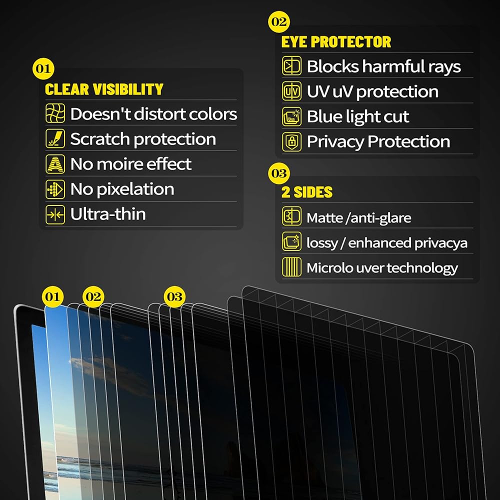 23.8 inch privacy screen for monitor perfect for open office settings, universities, financial institutions, health care providers, and corporate travel. Stop giving access to your confidential information to everyone around you outside the 60 degree viewing angle. 23.8'' privacy screen for monitor helps achieve this by limiting the viewing angle of your screen to a straight position so only you can see the contents of your screen while people on either side of it only see a darkened screen. also protects your eyes by filtering out 95% UV and curbing blue light by 60%, which can otherwise have an adverse impact on your eyes. The screen filter is reversible, giving you the flexibility to choose matte or glossy – Place the matte side facing you for reducing extra glare. 23.8 inch privacy screen for monitor also helps keep your screen safe from dust and scratches.