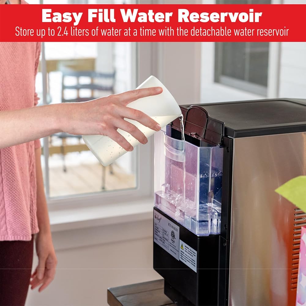 LARGE STORAGE CAPACITY - This nugget ice machine has a 2.4 liter (0.68 gallons) rear water reservoir that it automatically draws from during ice production - this can be filled through the flip-top lid when attached to the machine or can be removed and filled under a faucet tap (no water line connections available for this product). If any ice melts over time, it's redirected to the water reservoir to refill with a new batch.