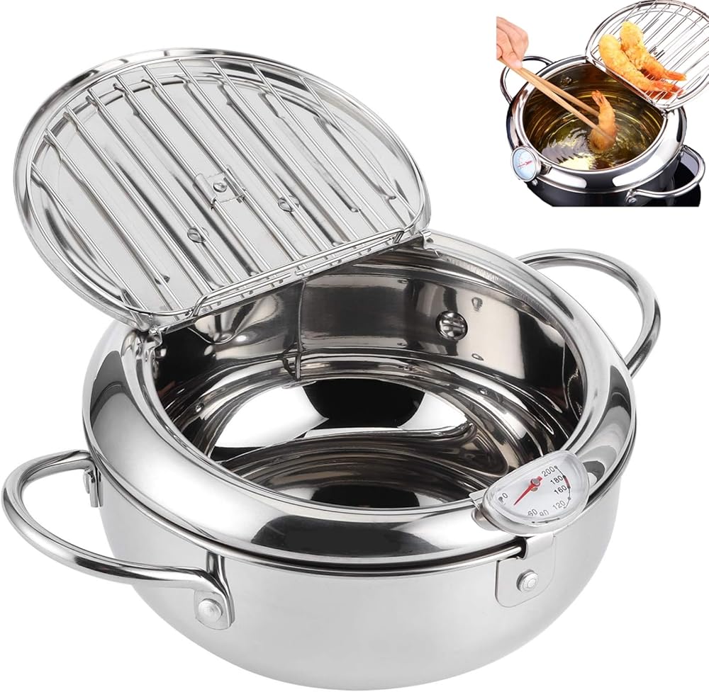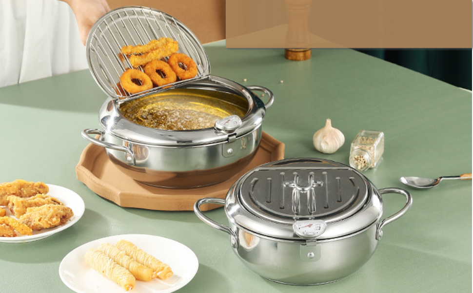 مادة متينة --- مجهزة بغطاء وعاء من الفولاذ المقاوم للصدأ قابل للرفع ومقبض قوس مثبت على الطراز الياباني، آمن وثابت للاستخدام. تحتوي المقلاة العميقة الصغيرة على مقبض قوس مثبت على الطراز الياباني، مما يجعل المقلاة العميقة الصغيرة آمنة وثابتة وسهلة الإمساك. المقبض بارد عند اللمس، لذلك من السهل تشغيل مقلاة تيمبورا.