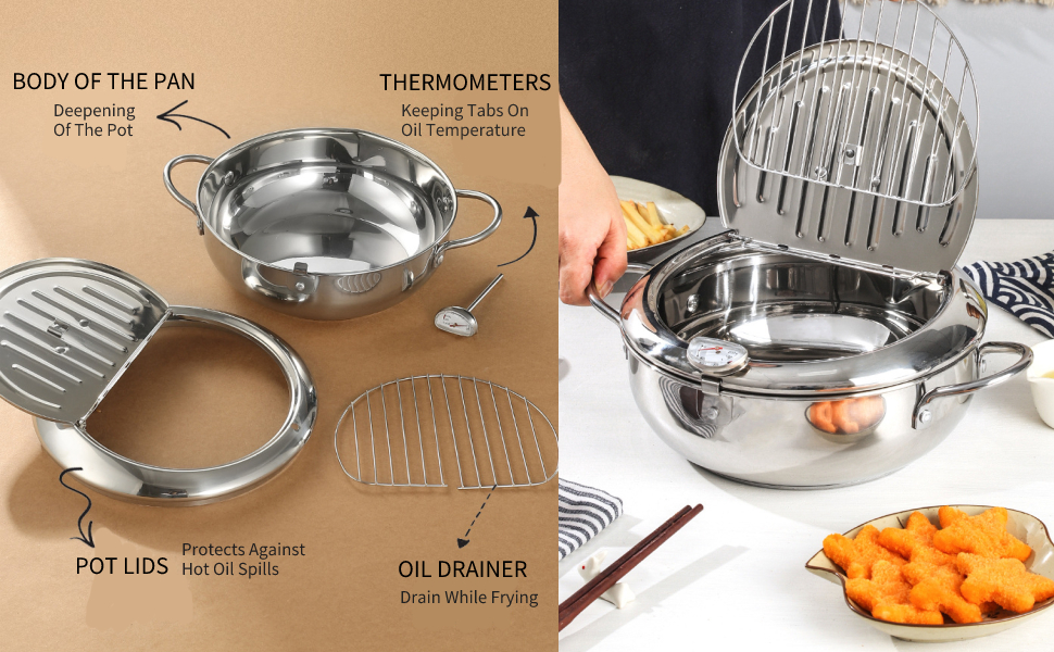 سهل التنظيف --- باستثناء مقياس الحرارة، يمكن تفكيك جميع الأجزاء لسهولة التنظيف. استخدم صابون الأطباق ومنصات الأطباق الناعمة لتسهيل عملية التنظيف. تتوافق المقلاة مع مصادر الحريق المختلفة، بما في ذلك مواقد الغاز، ومواقد الحث، والمواقد الكهربائية ومصادر الحريق الأخرى.