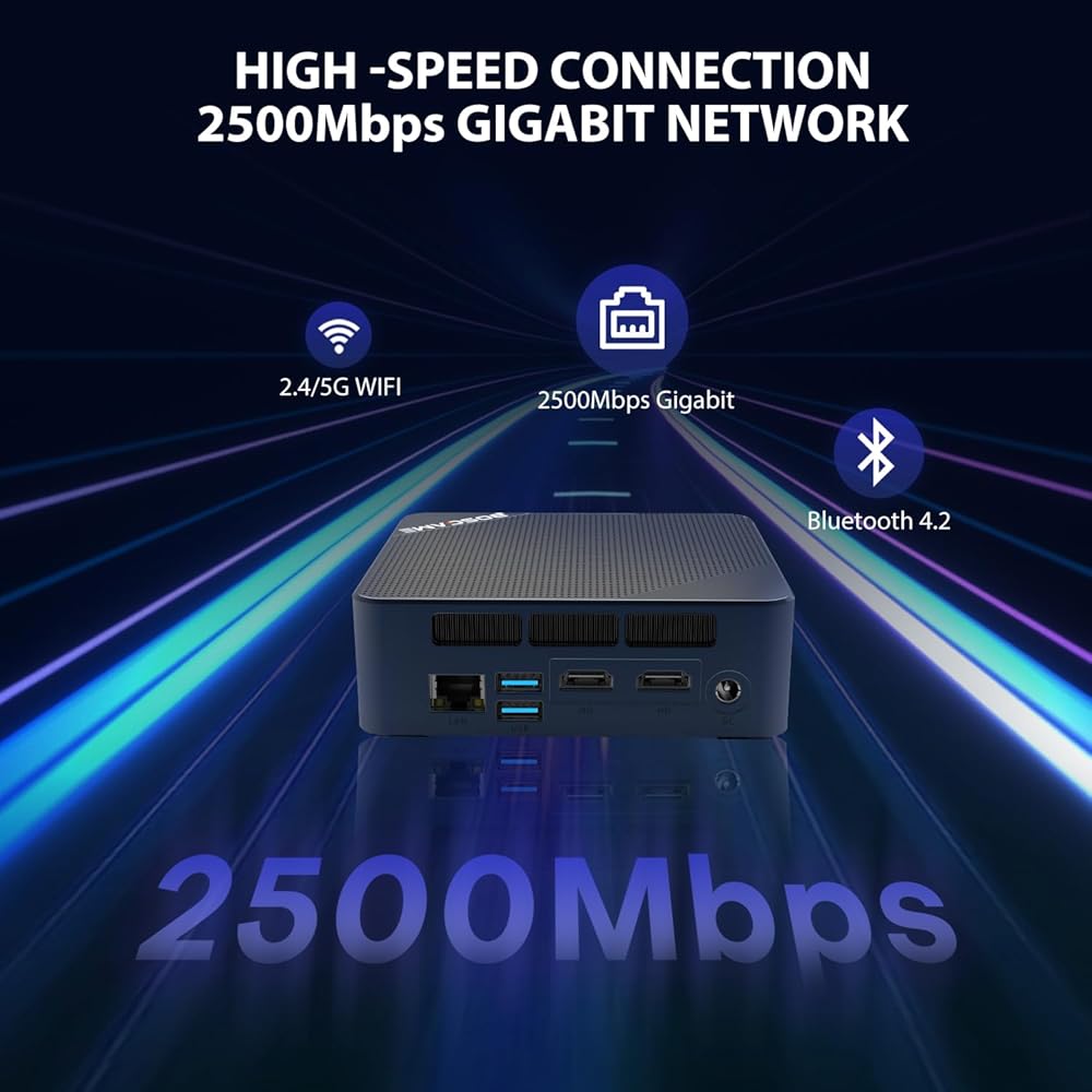 🎈【Wi-Fi 6E & BT5.2 & 2.5 Gigabit Ethernet 】 تم تجهيز الكمبيوتر المكتبي الصغير بـ 2.5 Gigabit Ethernet وWi-Fi 6E وBluetooth 5.2. يوفر Wi-Fi 6E معدلات نقل بيانات أعلى تصل إلى 10 جيجابت في الثانية، ويوفر البلوتوث 5.2 معدلات نقل بيانات أسرع تصل إلى 2 ميجابت في الثانية ومسافات نقل أطول، مما يضمن اتصالاً مستقرًا.